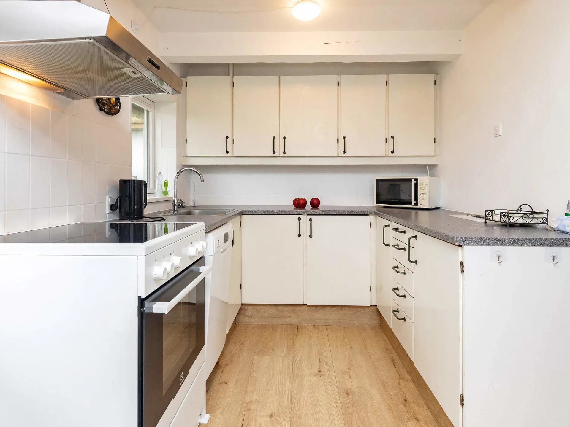 Das Haus hat eine gut ausgestattete Küche mit direktem Zugang zum Wohn- und Essbereich. Dort stehen u.a. ein Holzofen und ein Fernseher mit Chromecast zum Streamen eigener Anbieter bereit.. Das Badezimmer des Hauses ist zweigeteilt; ein Teil mit Badewanne, das andere ein Toilette mit Waschbecken. Im praktischen Hauswirtschaftsraum befindet sich eine Waschmaschine und ein Wäschetrockner.