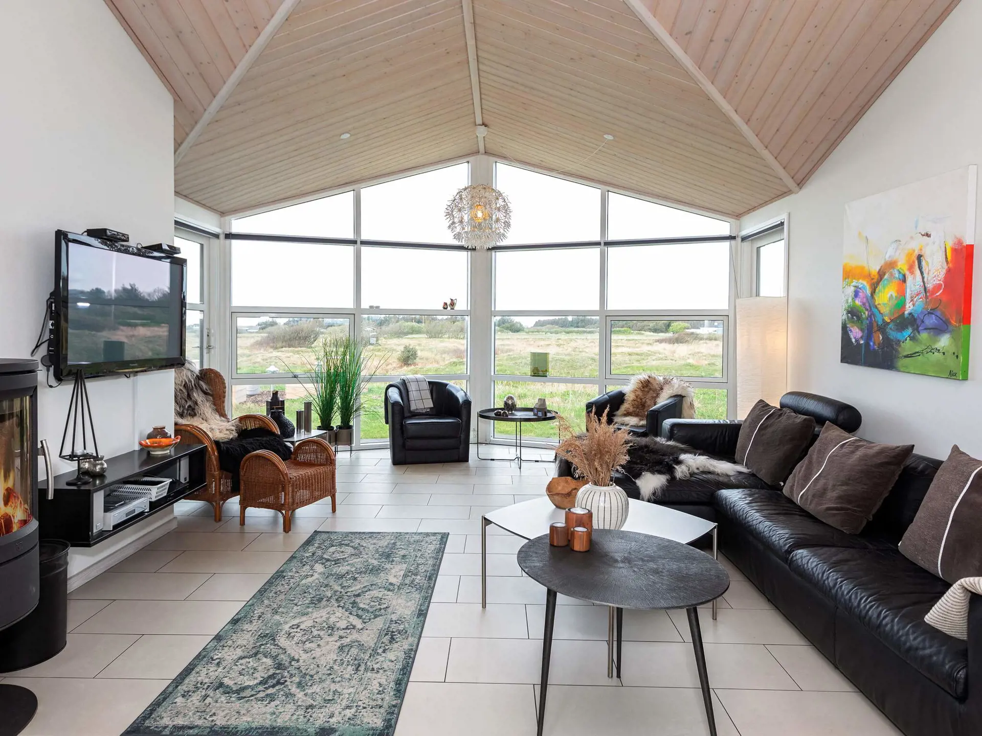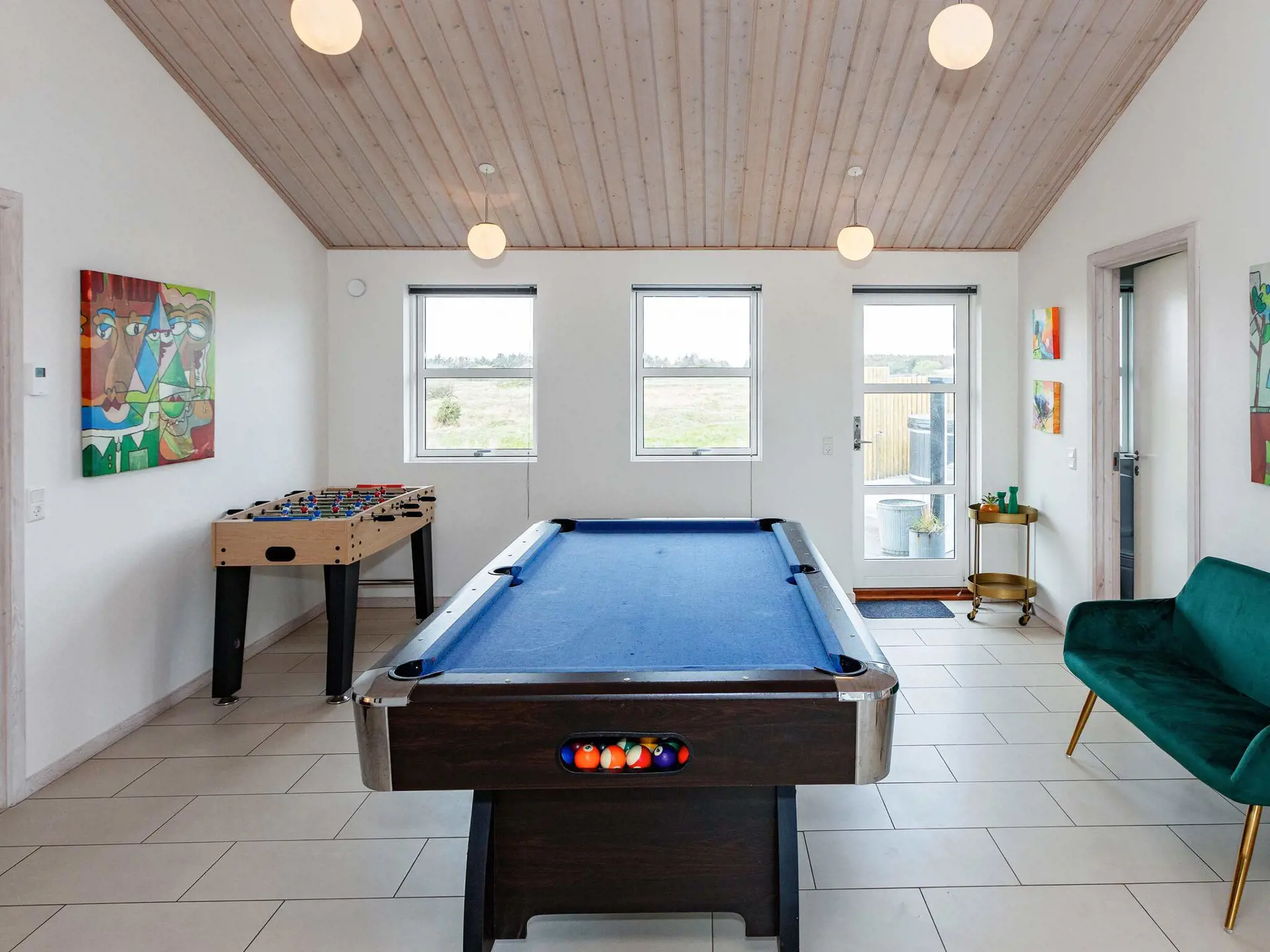 Geschmackvolles Mobiliar, hochwertig und in typisch dänischem Design. Für Abwechslung sorgen im Aktivitätsraum Billard und Tischfußball. Zudem geräumiger Wohnbereich mit schöner Sitzecke und Essbereich. Für die Jüngsten steht im Haus ein Hochstuhl bereit.