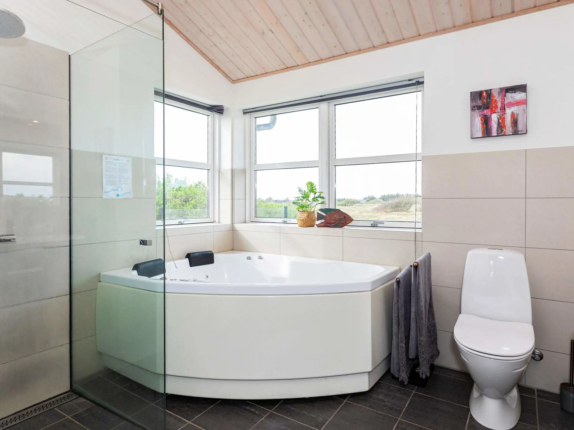 Attraktives Bad mit Whirlpool und Sauna für erholsame Stunden im Haus. Je zwei Schlafzimmer und ein Bad an je einem Hausende, ideal für den Mehrfamilienurlaub. Durchgehend angenehme Fußbodenheizung im Haus.