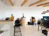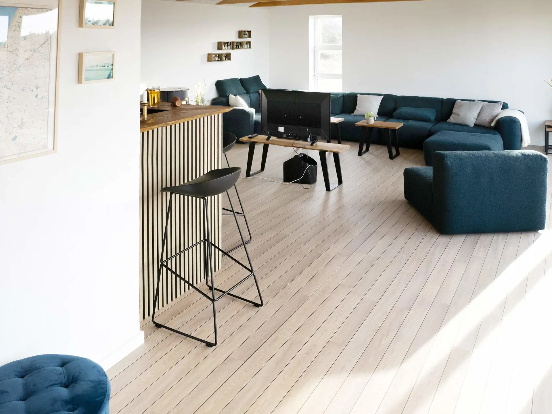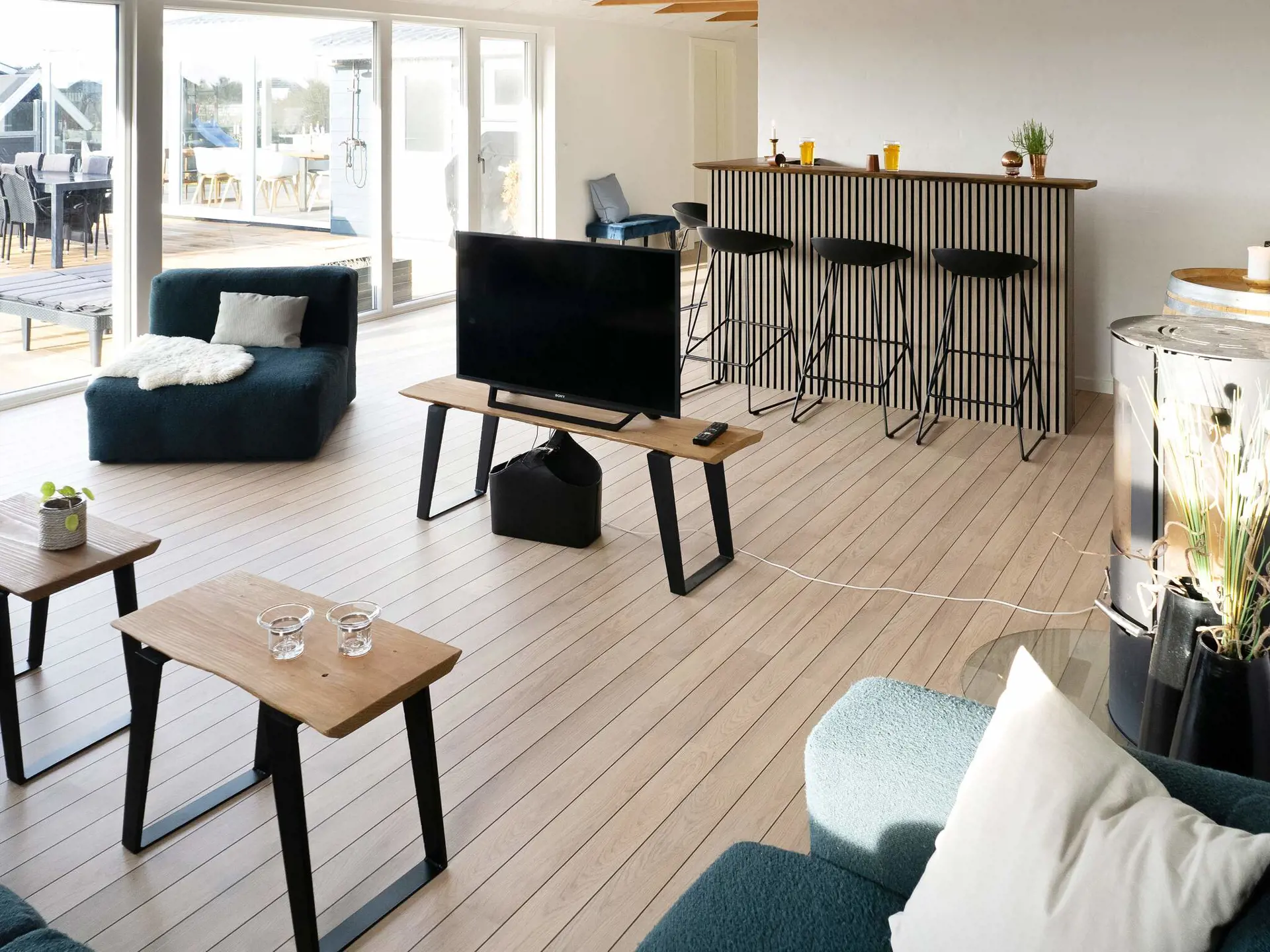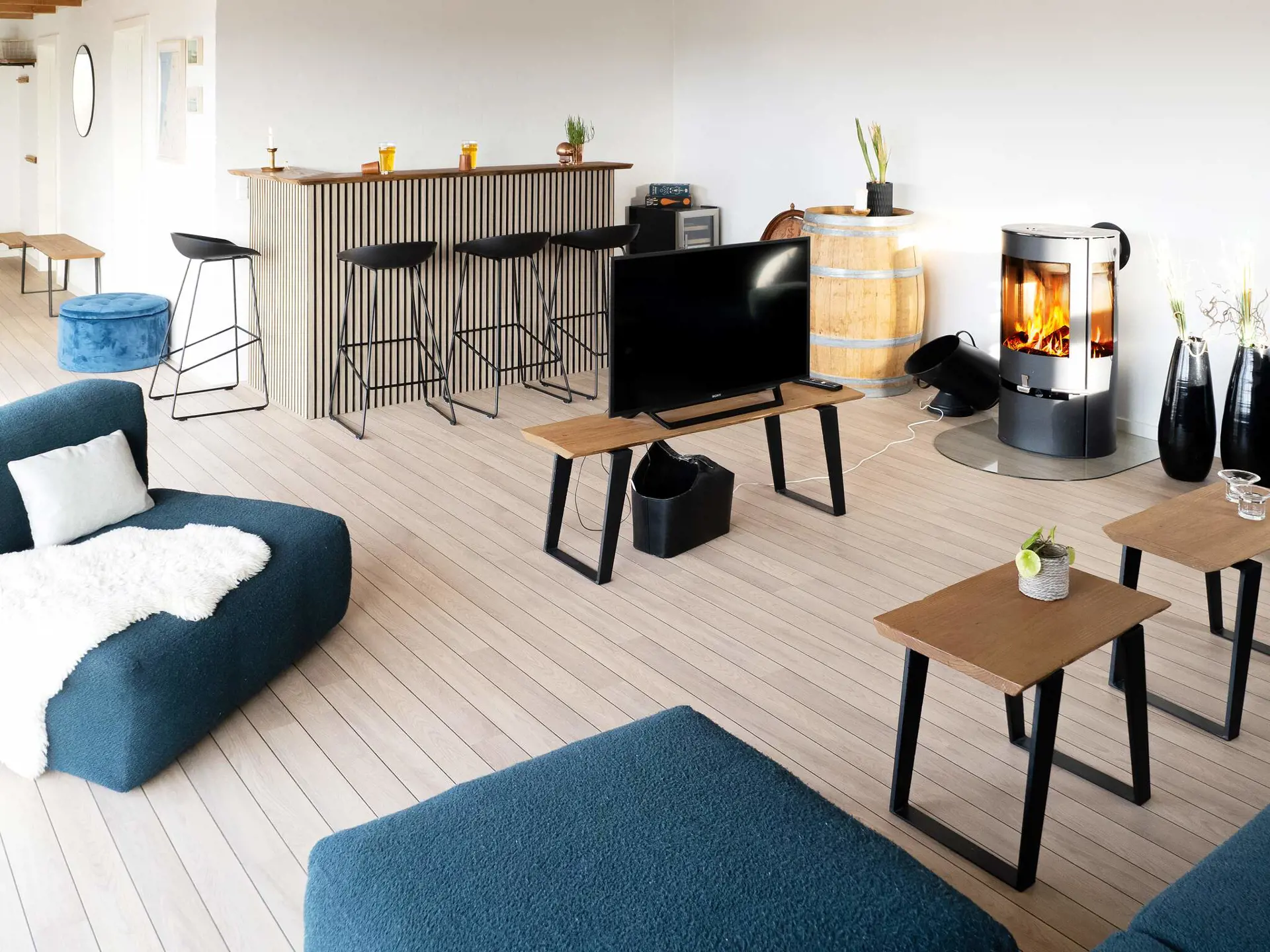 Große Eingangsdiele mit Zugang zu zwei hellen Schlafzimmern mit Doppelbett und einem großen Wohnzimmer mit offener Zimmerdecke bis zum First und sichtbaren Deckenbalken sowie gemütlichem Holzofen und klimafreundlicher Wärmepumpe. Des Weiteren ist das Wohnzimmer mit Bartheke und gemütlicher Sitzecke mit TV ausgestattet. TV nur zum Streamen eigener Anbieter über WLAN und Chromecast.