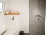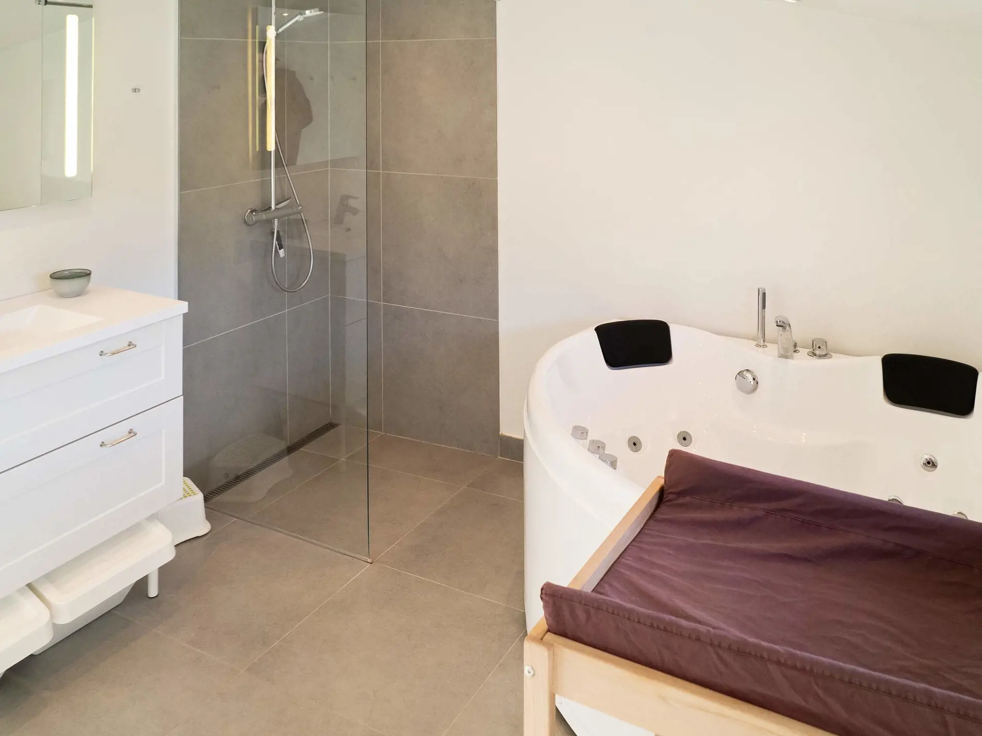 Vom Eingangsbereich aus gelangt man in eine große Essküche und weiter zu zwei weiteren Schlafzimmern mit Doppelbett sowie zu einem Badezimmer mit Dusche und einem großen Wellnessbad mit Dusche und Whirlpool für zwei Personen. Praktischer Hauswirtschaftsraum mit Waschmaschine und Trockner. Nicht zu vergessen ist der große Wohnbereich für das Familienleben.