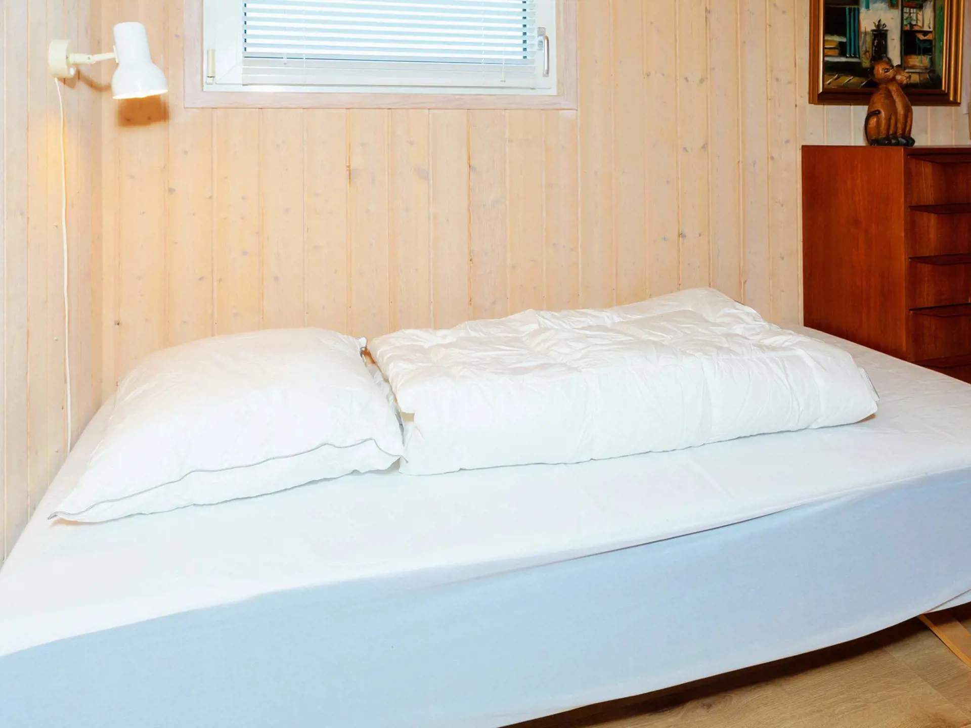 Im Inneren des Ferienhauses befindet sich ein offener Wohnraum, der mit der Küche verbunden ist und direkten Zugang zur Terrasse bietet. Das Badezimmer ist mit einer Dusche und einer Waschmaschine ausgestattet. Es gibt zwei Schlafzimmer sowie eine verglaste Veranda, auf der Sie Sommerabende länger genießen können. Für Familien mit Kleinkindern steht ein Kinderbett zur Verfügung.