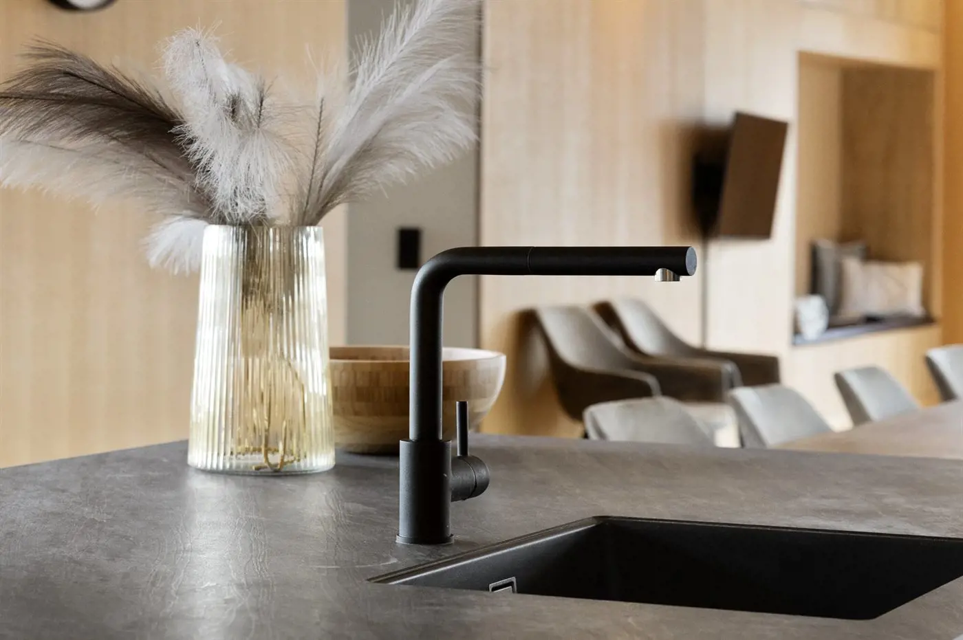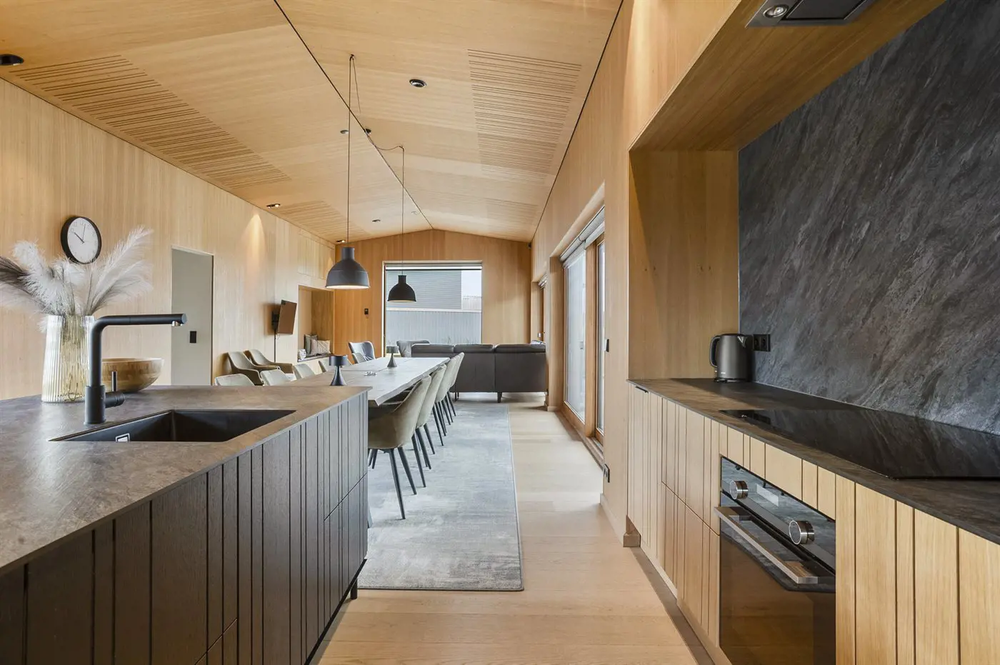 Die Küche ist mit Kühlschrank ausgestattet. Außerdem gibt es 4 Induktions-Kochzonen, Umluftofen sowie Geschirrspüler.