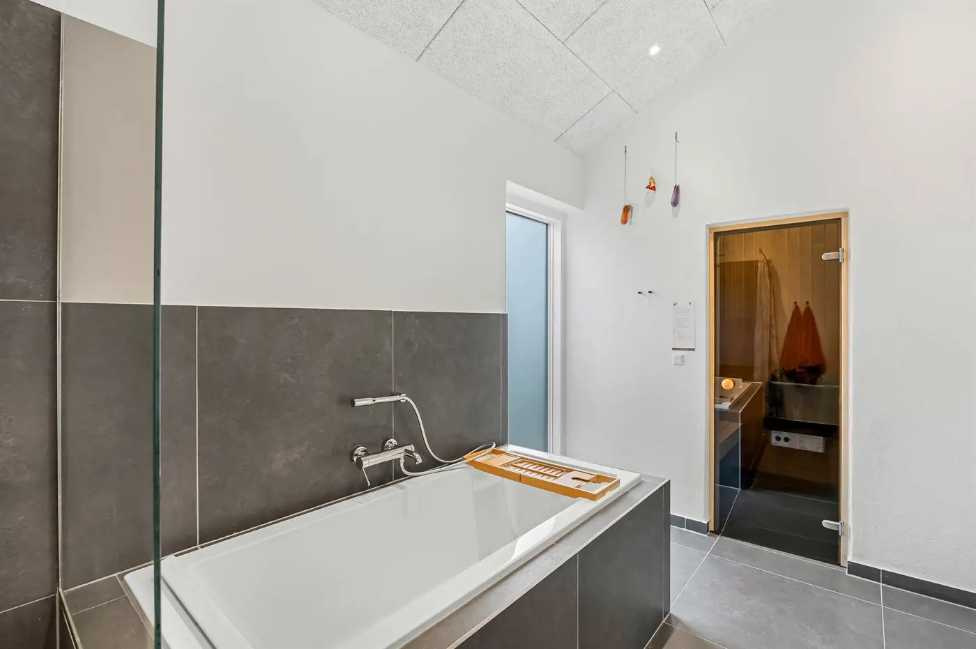 Es gibt 2 Badezimmer mit Duschnische und 2 Toiletten. Fußbodenheizung in 2 Badezimmern. Es steht eine Sauna zur Verfügung in der Sie sich so richtig entspannen können.
