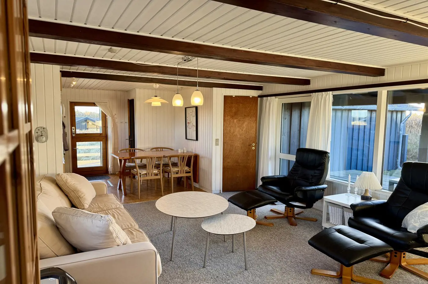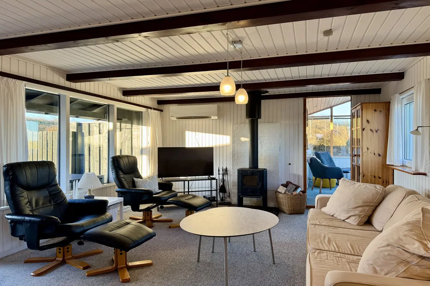 Innen erwartet dich eine helle, entspannte Atmosphäre mit großen Fensterflächen, die die Natur ganz nah heranholen – mit Strandhafer direkt vor dem Fenster. Wohnbereiche und Küche sind offen miteinander verbunden und schaffen einen harmonischen Rahmen für gemeinsames Beisammensein. Das Haus verfügt über zwei Schlafzimmer sowie ein Schlafsofa, ein Badezimmer und ein separates WC und wird mit Wärmepumpe und Kaminofen beheizt.