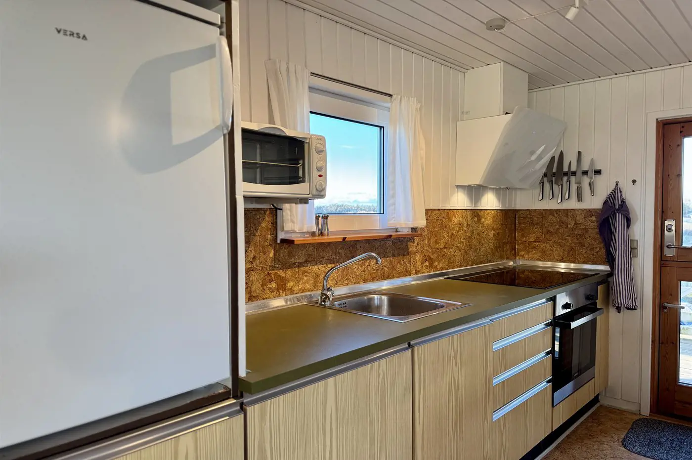 Die Küche ist mit Kühlschrank ausgestattet. Außerdem gibt es 4 Induktions-Kochzonen, Umluftofen.