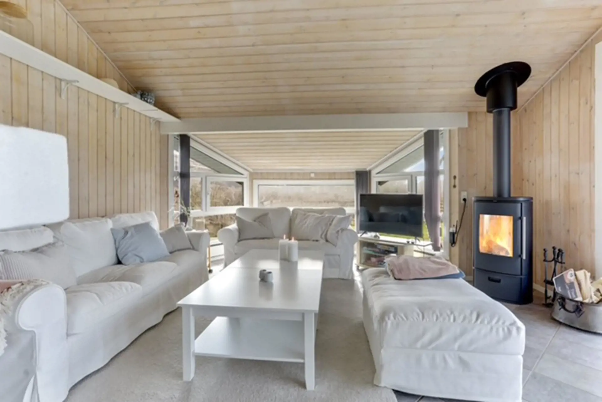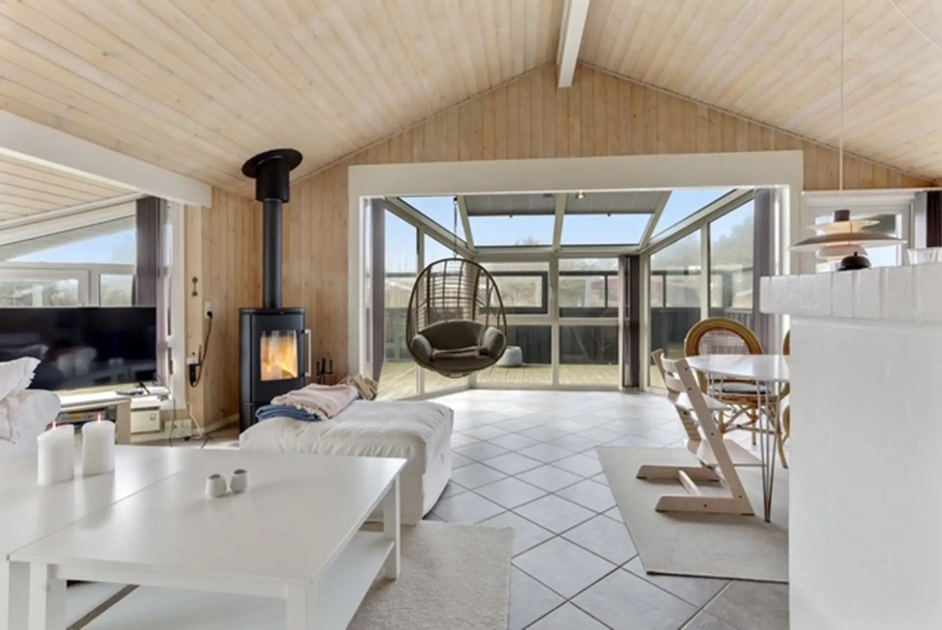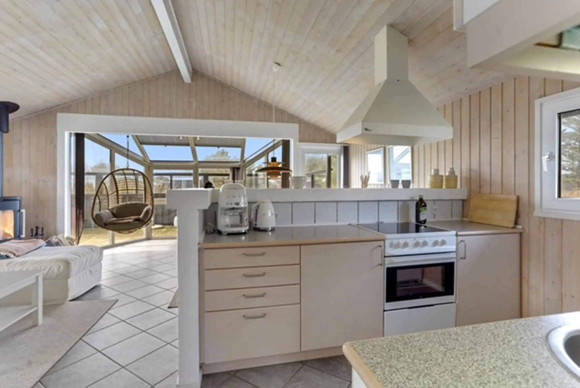 Der natürliche Mittelpunkt des Hauses ist der helle Wohnbereich, in dem Küche und Essplatz offen miteinander verbunden sind. Hier finden Sie alles, was Sie zur Zubereitung Ihrer Urlaubsmahlzeiten benötigen. In der Sofaecke können Sie vor dem Kaminofen mit einem guten Buch oder einem Film entspannen, während große Fensterfronten viel Tageslicht hereinlassen und eine ganz besondere Atmosphäre schaffen.