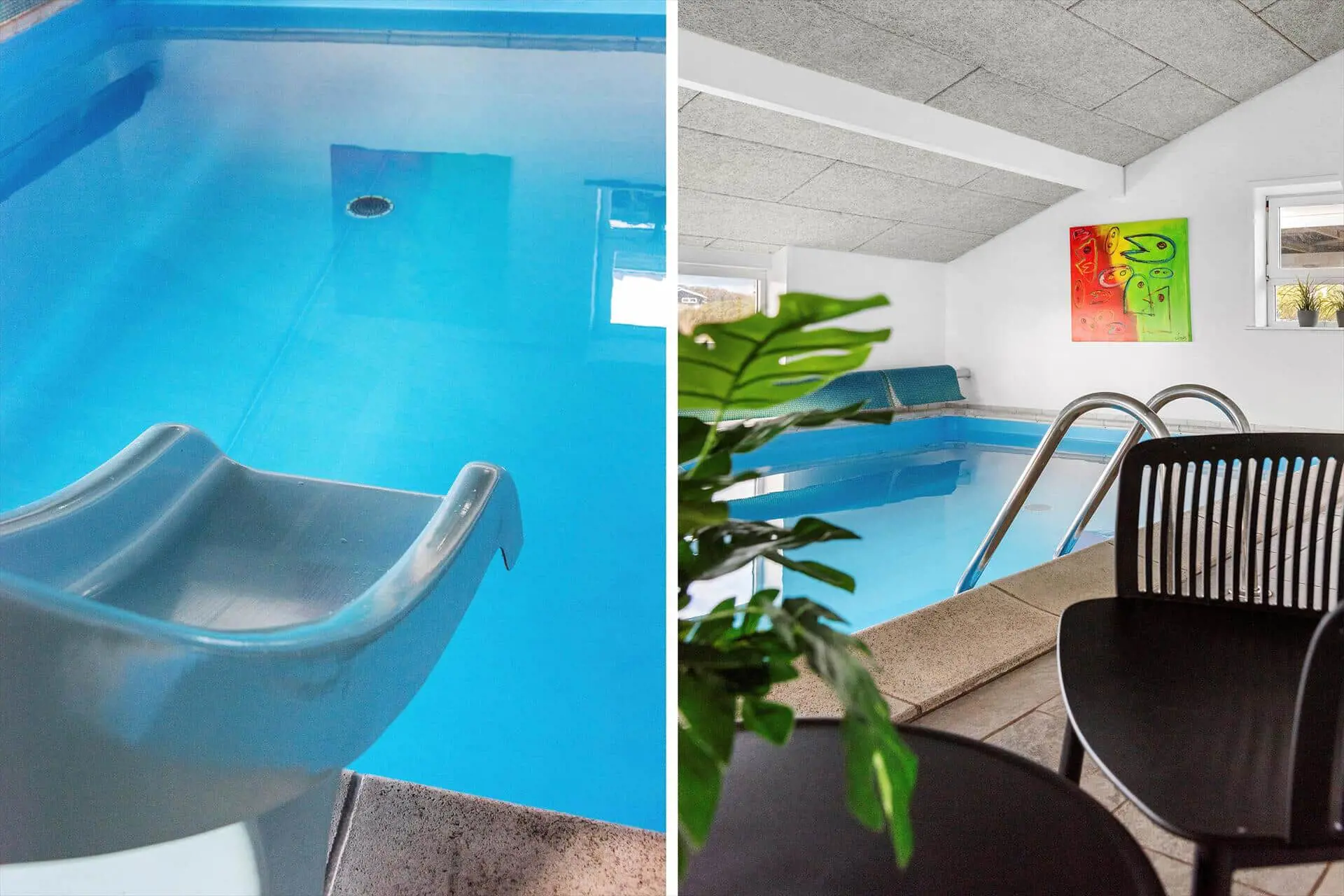 Innen empfängt dich ein äußerst gepflegtes Ferienhaus mit einer durchdachten Einrichtung, in dem offene Decken und große Fensterfronten für eine schöne Atmosphäre und ein fantastisches Licht sorgen. Das Herz des Hauses ist der Wohnbereich, in dem die Küche offen mit dem Wohnzimmer verbunden ist, sodass du kochen kannst, während am Esstisch oder vor dem knisternden Kaminofen lebhaft geplaudert wird. Vom Wohnzimmer aus hast du Blick auf den einladenden Poolbereich, wo Whirlpool und Sauna für zusätzlichen Luxus und Entspannung im Urlaub sorgen. Hier kannst du ein erfrischendes Bad nehmen, dich in der Sauna aufwärmen oder im sprudelnden Wasser entspannen, wenn der Tag zu Ende geht. Das Ferienhaus bietet außerdem drei gute Schlafzimmer, zwei Badezimmer sowie einen gemütlichen Hems mit zusätzlichem Platz zum Entspannen oder Spielen.