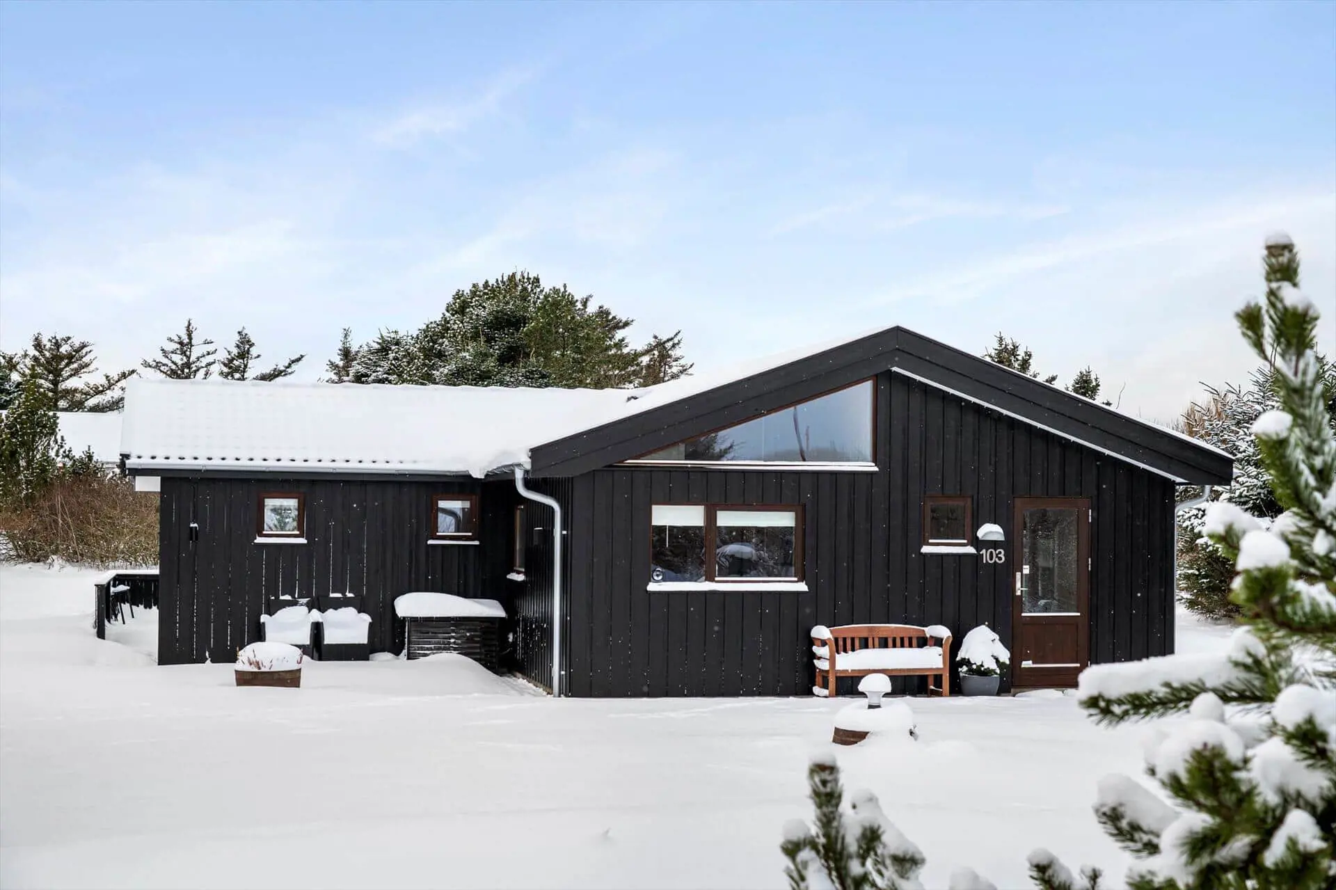 Das Haus ist sehr geräumig und mit modernen und hellen Möbeln eingerichtet. Vom Eingangsbereich gelangen Sie in die Küche, die offen mit dem großen Wohnzimmer kombiniert ist. Es stehen drei Schlafzimmer mit ausreichend Stauraum zur Verfügung. Das Haus bietet zwei Badezimmer, davon ist eins mit Whirlpool und Sauna ausgestattet. Die großen Panoramafenster im Wohnzimmer bieten einen tollen Lichteinfall und vom Wohnzimmer blicken Sie auf das große Grundstück.