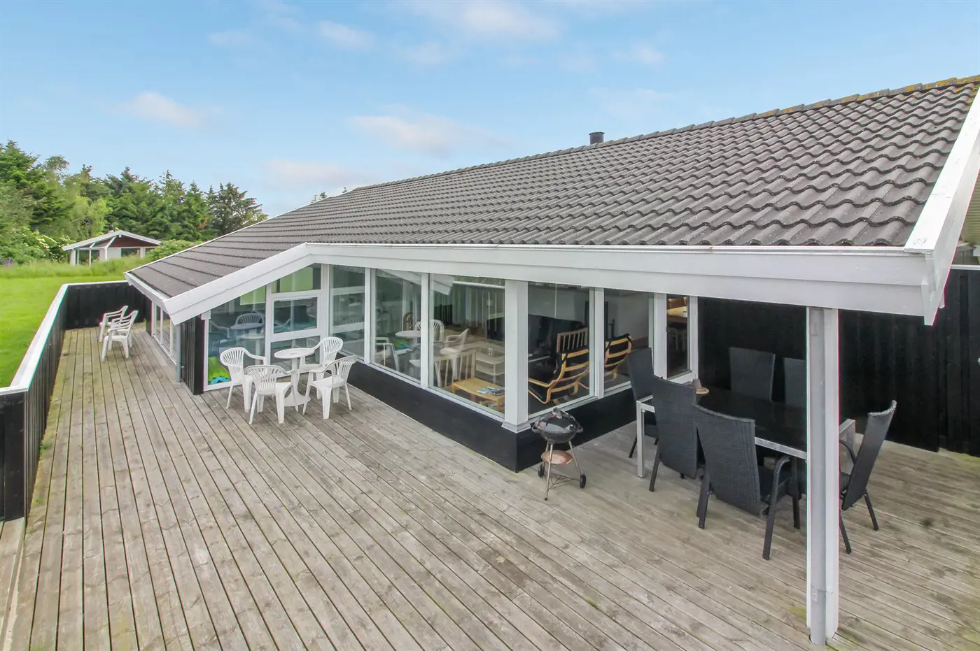 Die Ferienunterkunft liegt auf einem 1450 m² großen Naturgrundstück. Die Entfernung zum Meer beträgt 950 m. Die nächste Einkaufsmöglichkeit liegt 900 m entfernt. Es steht ein 30 m² Terrassenareal zur Verfügung. Außerdem gibt es 8 m² überdachte Terrasse. Geräteraum. Schaukel. Sandkasten. Trampolin. Es steht ein Grill zur Verfügung.