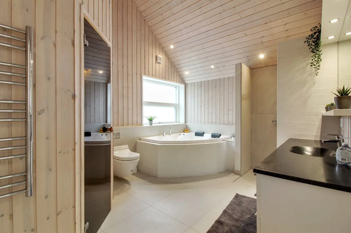 Es gibt 1 Badezimmer mit Duschnische und 1 Toilette.. Fußbodenheizung in 1 Badezimmer. Es steht eine Sauna zur Verfügung in der Sie sich so richtig entspannen können.