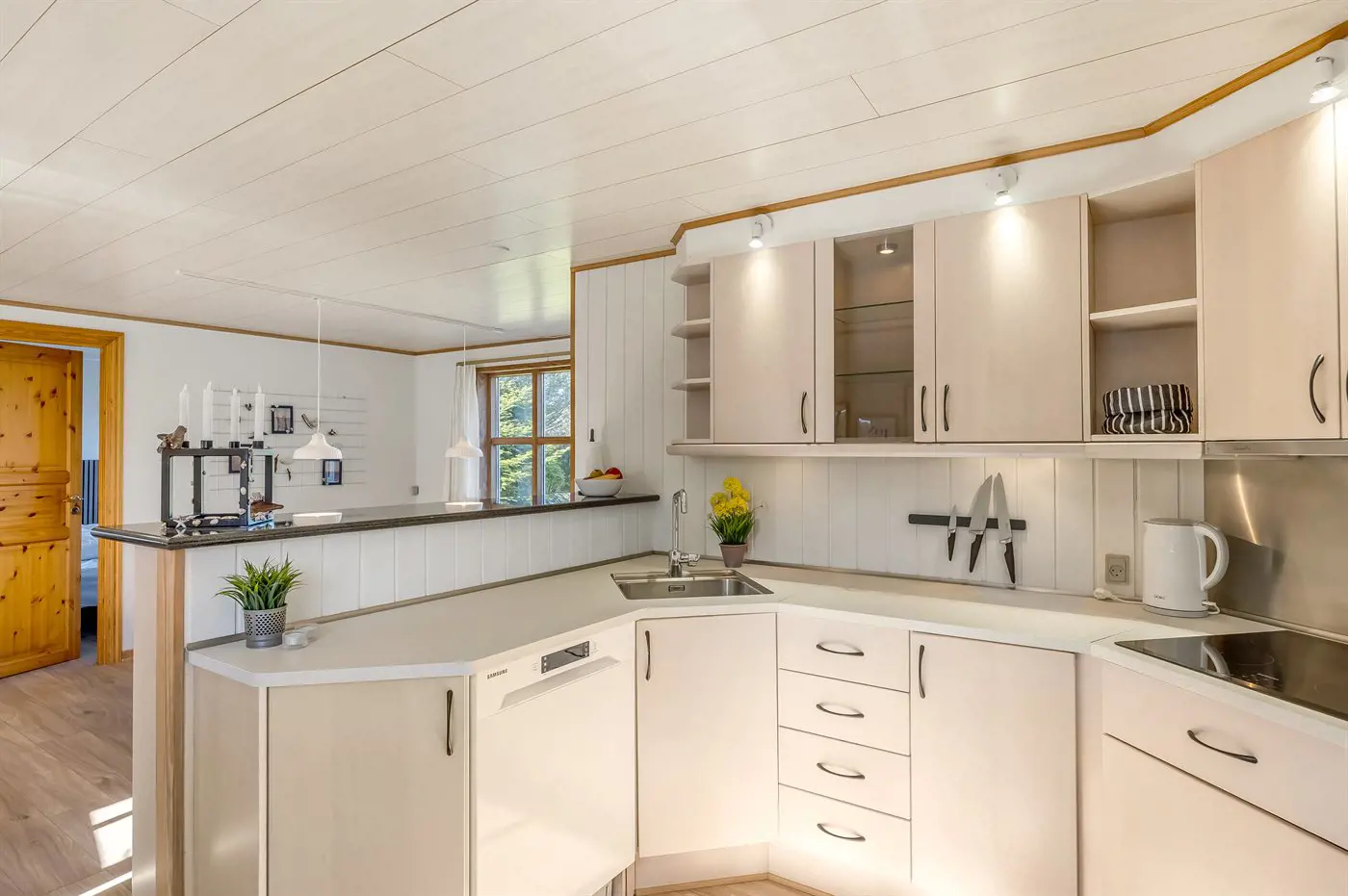 Die Küche ist mit Kühlschrank ausgestattet. Außerdem gibt es 4 Induktions-Kochzonen, Umluftofen, Mikrowelle sowie Geschirrspüler.