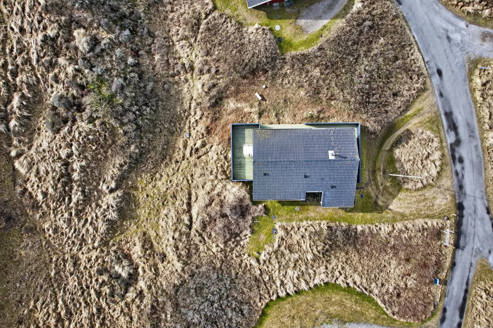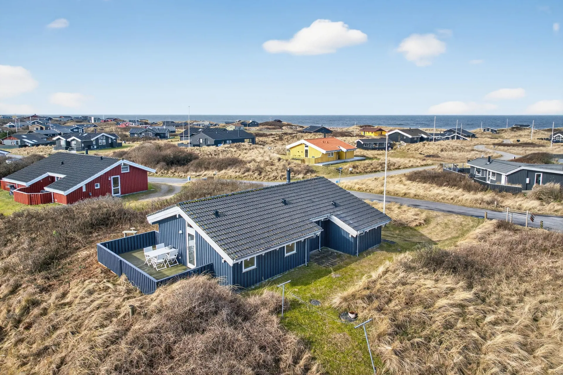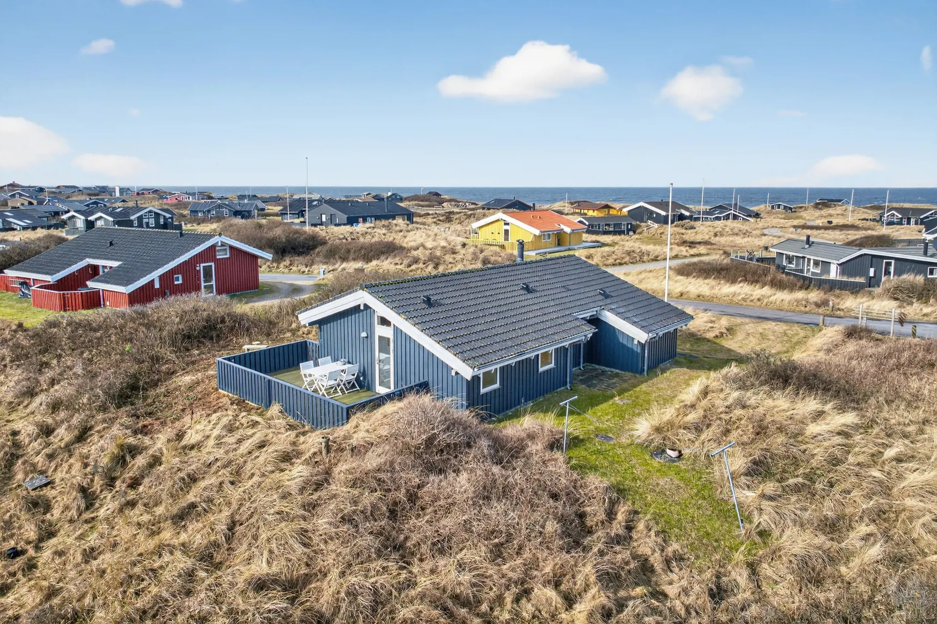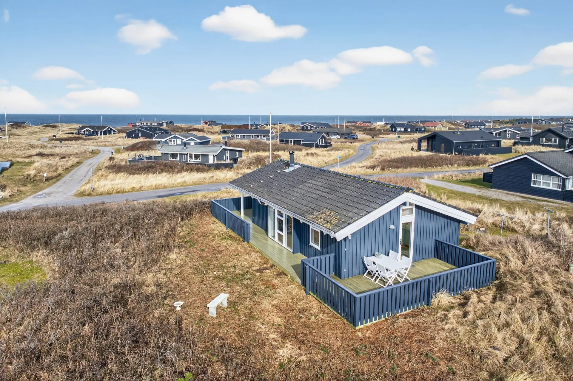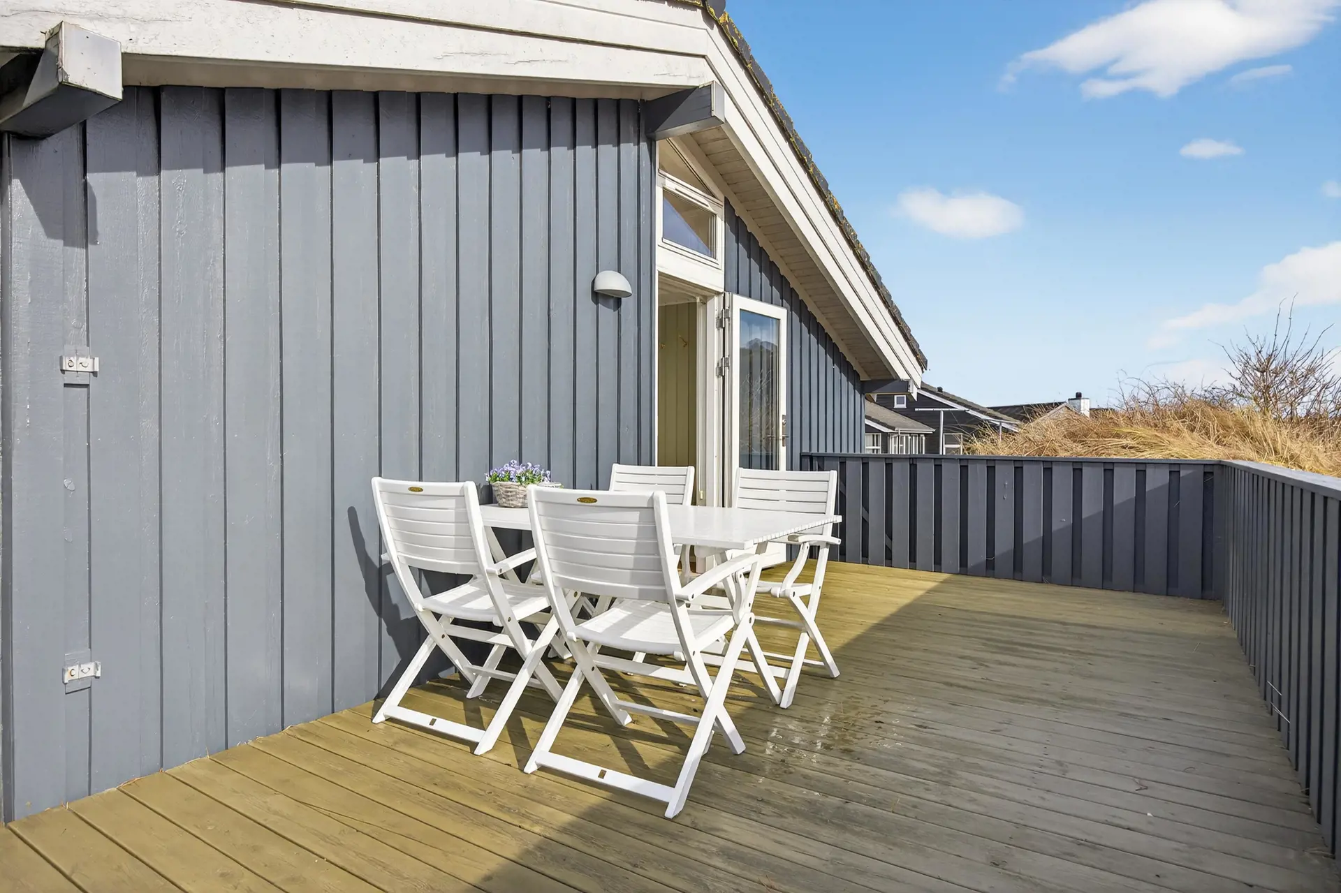Vor dem Haus liegt eine große überdachte Terrasse – der perfekte Ort für ein gemütliches Abendessen, während die Sonne langsam am Horizont untergeht. Die Kombination aus Aussicht, Natur und frischer Meeresluft schafft eine ganz besondere Atmosphäre der Entspannung an der Westküste.