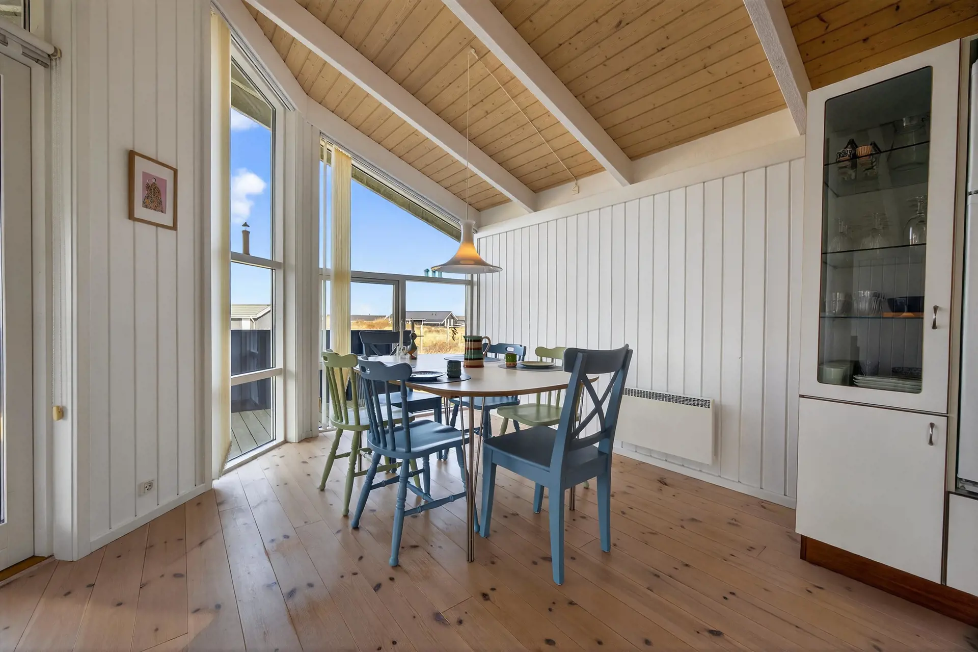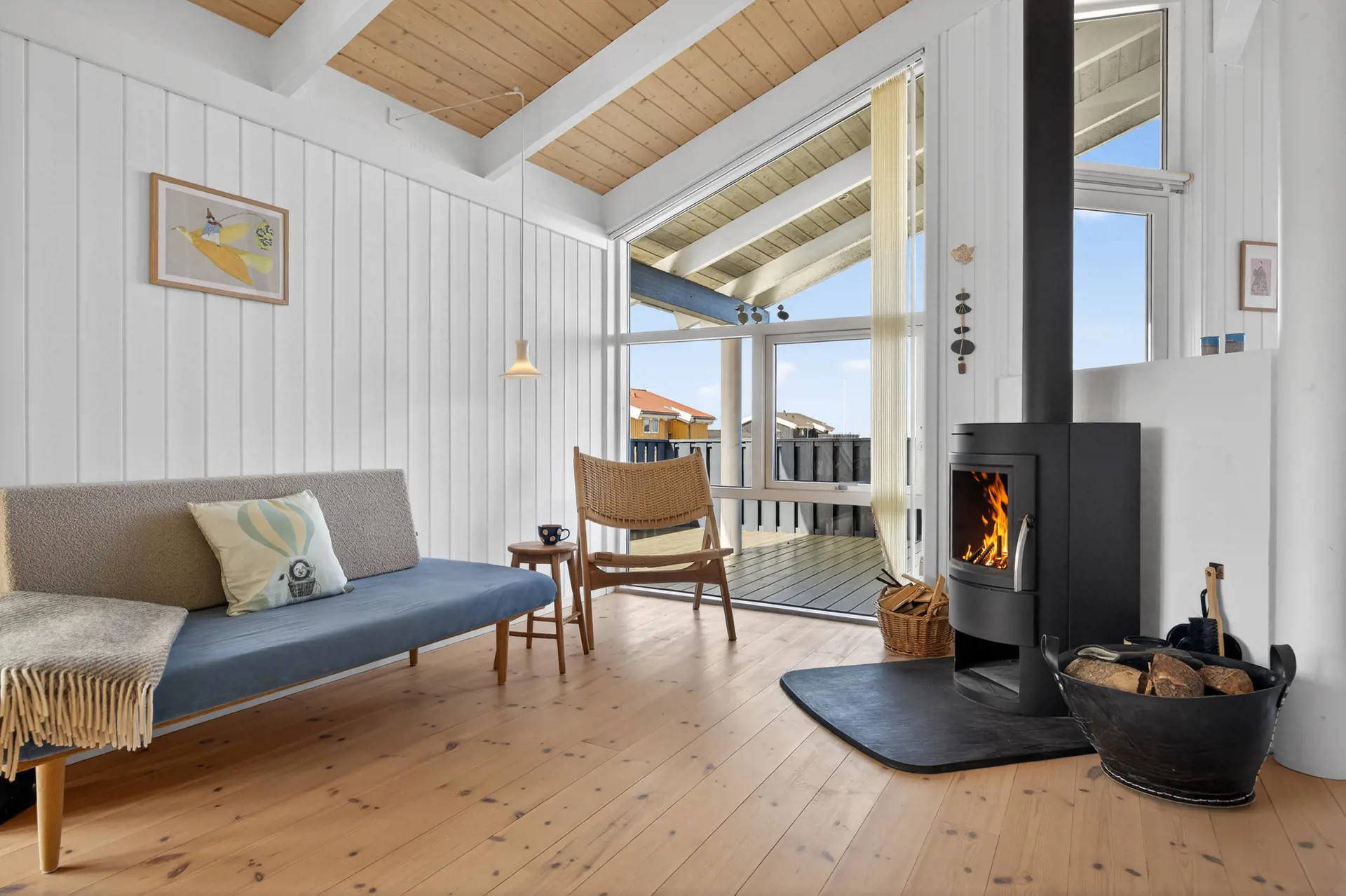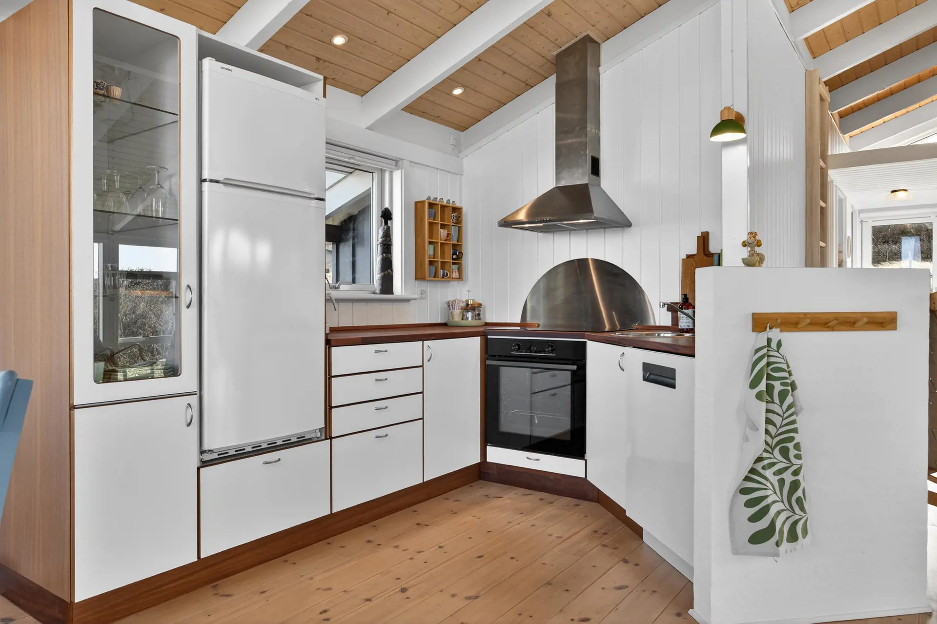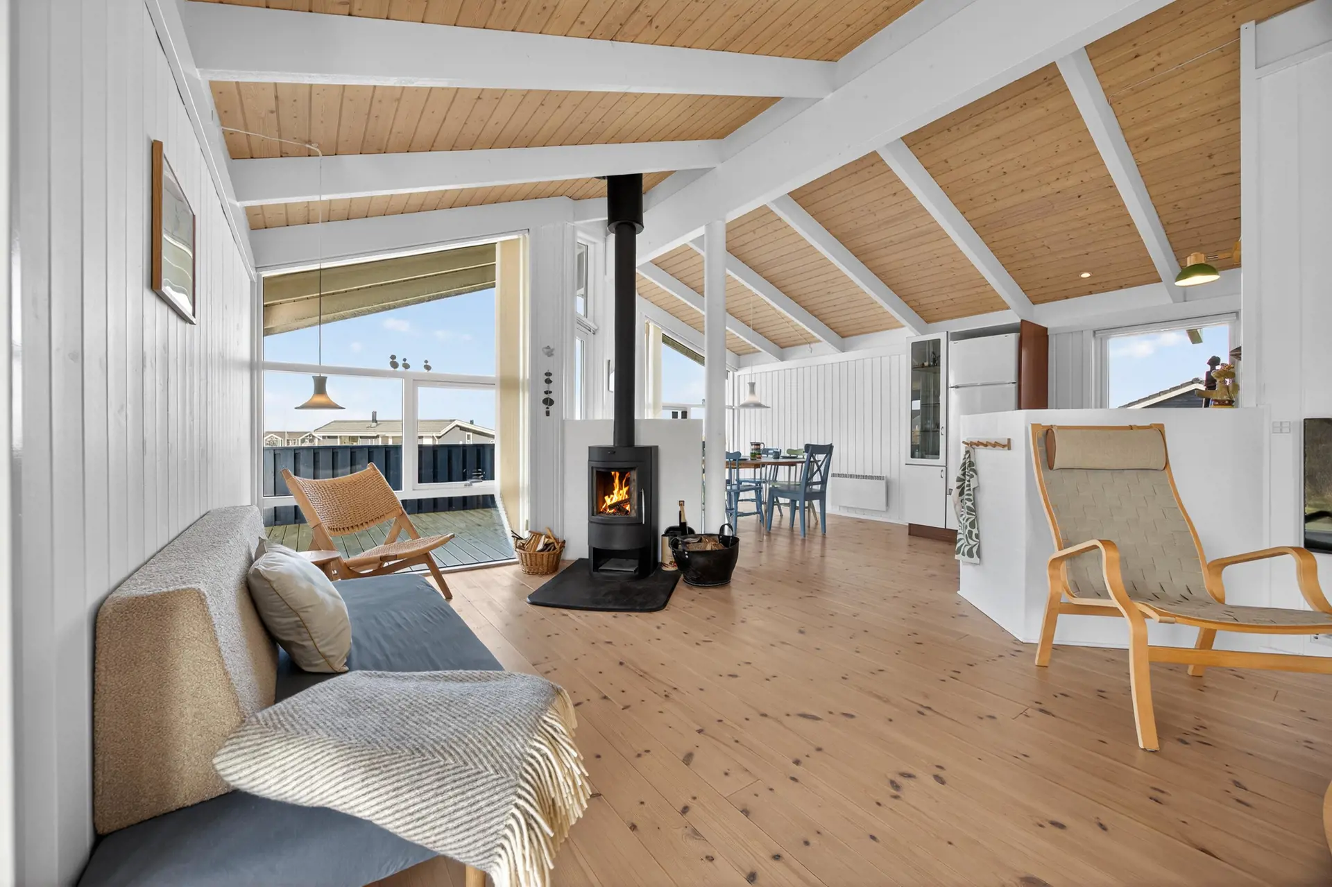 Die Küche ist offen mit dem Essbereich verbunden und bietet alles, was Sie für die Zubereitung köstlicher Urlaubsmahlzeiten benötigen. Wenn an kühleren Tagen der Wind draußen kräftig weht, können Sie den Kaminofen anheizen und nach einem langen Tag am Strand die wohlige Wärme und das knisternde Feuer genießen.
