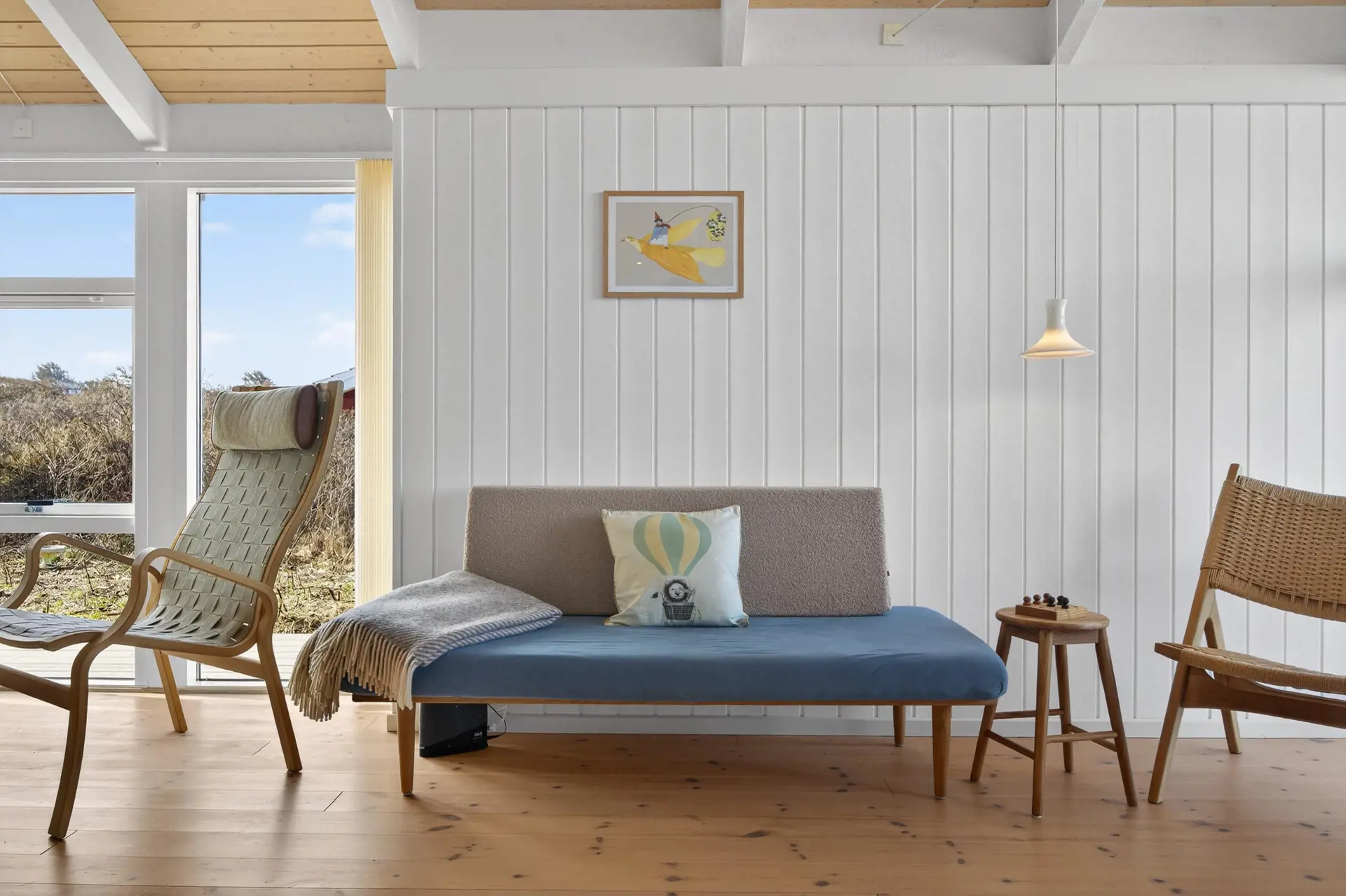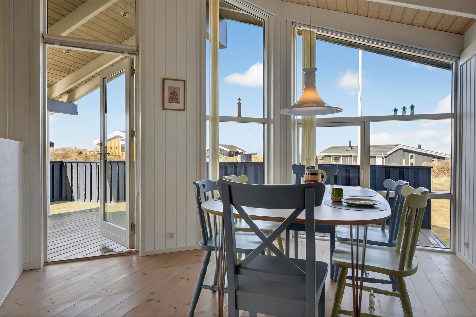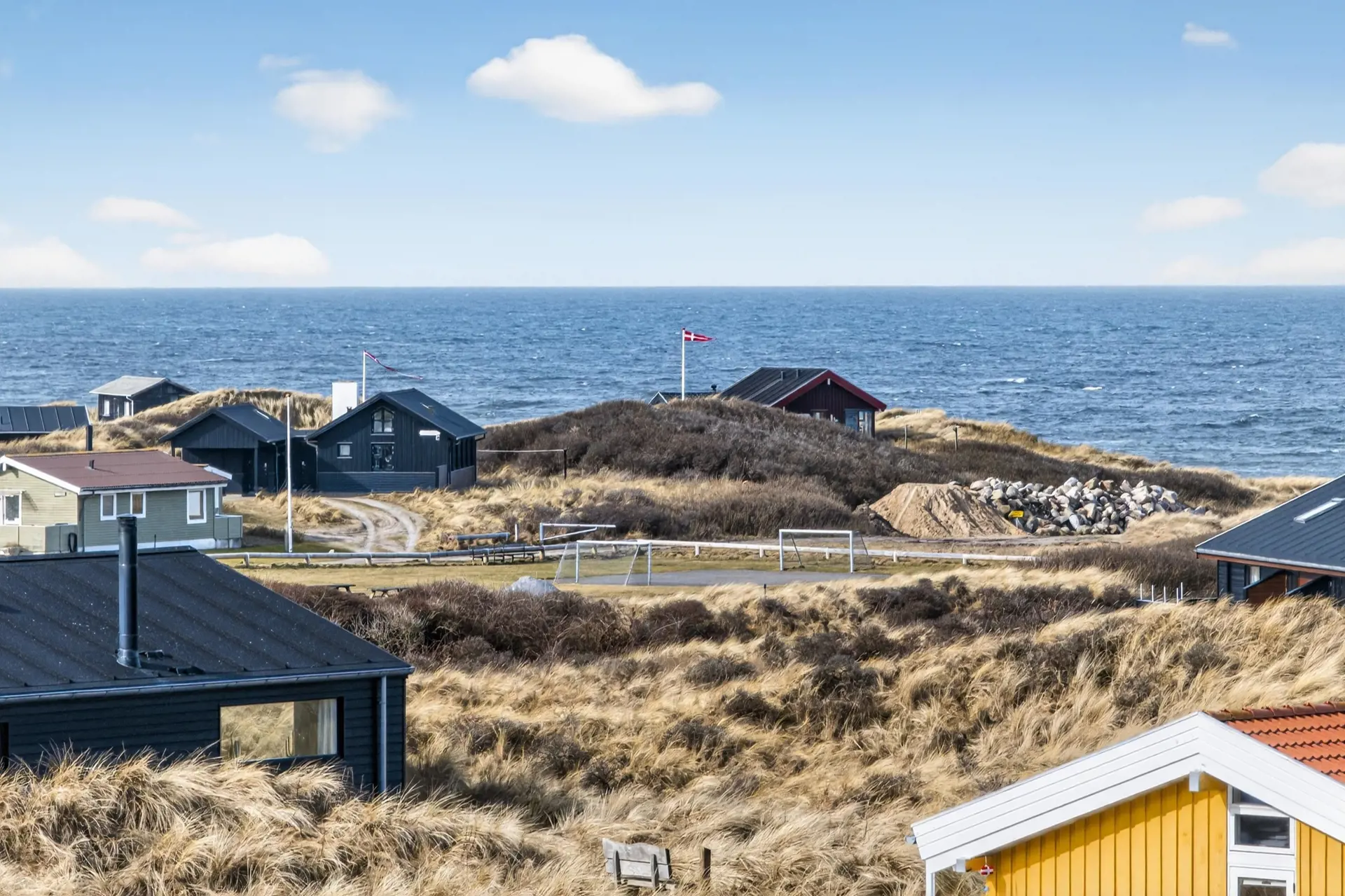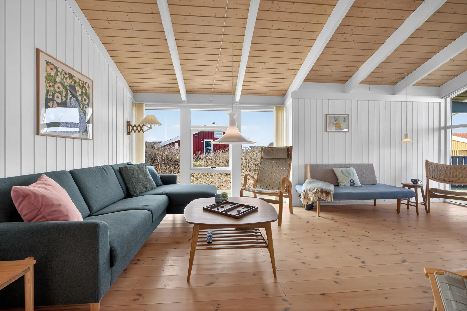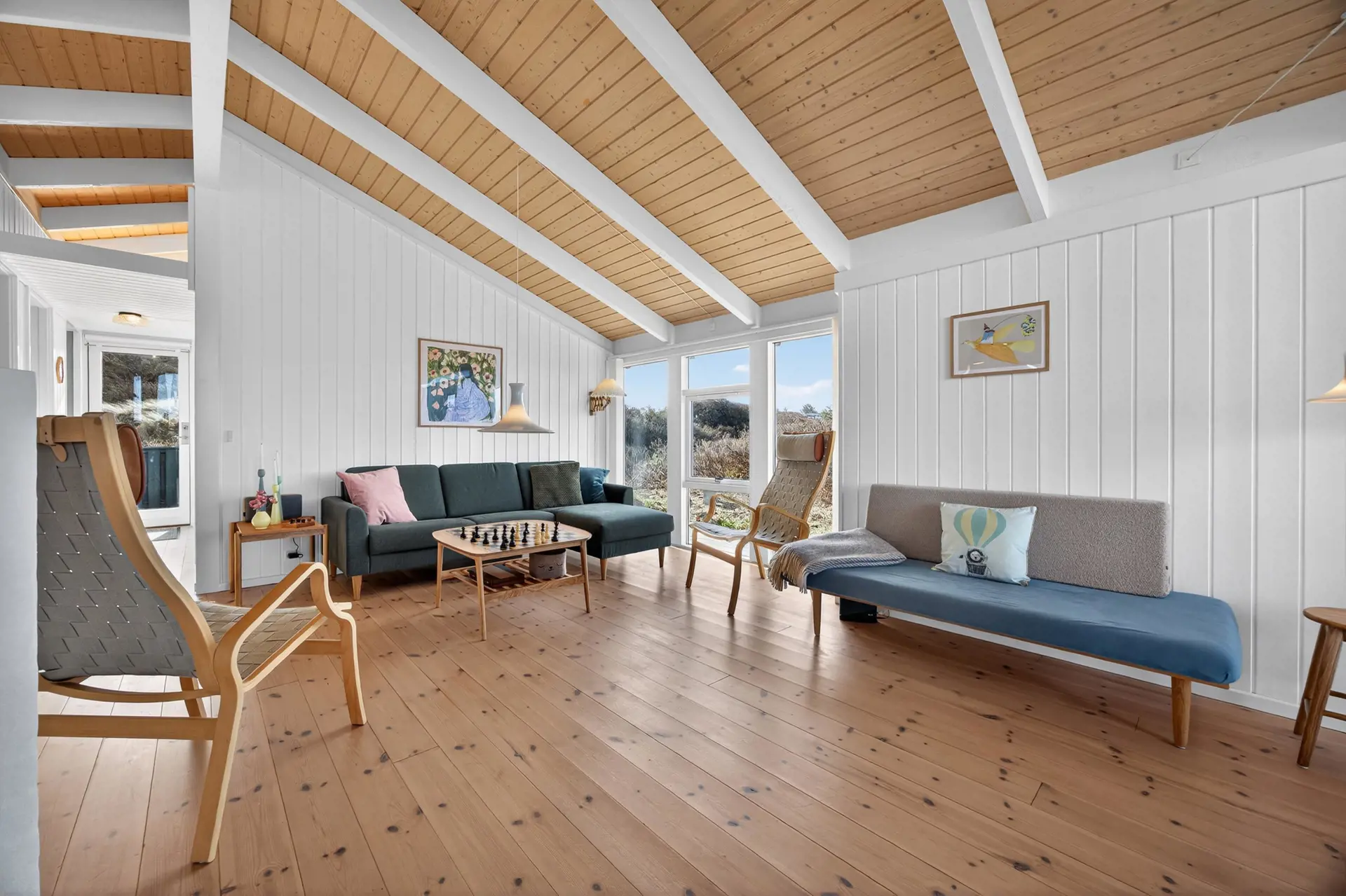 Das Herz des Hauses ist der große Wohnbereich mit offenem Dach bis zum First und großen Fensterfronten, die viel Licht und Natur hereinlassen. Von hier aus genießen Sie eine fantastische Aussicht über die Dünen und die kleinen Ferienhäuser – mit der malerischen Nordsee im Hintergrund. An klaren Abenden können Sie einige der schönsten Sonnenuntergänge der Westküste direkt vom Wohnzimmer aus erleben.
