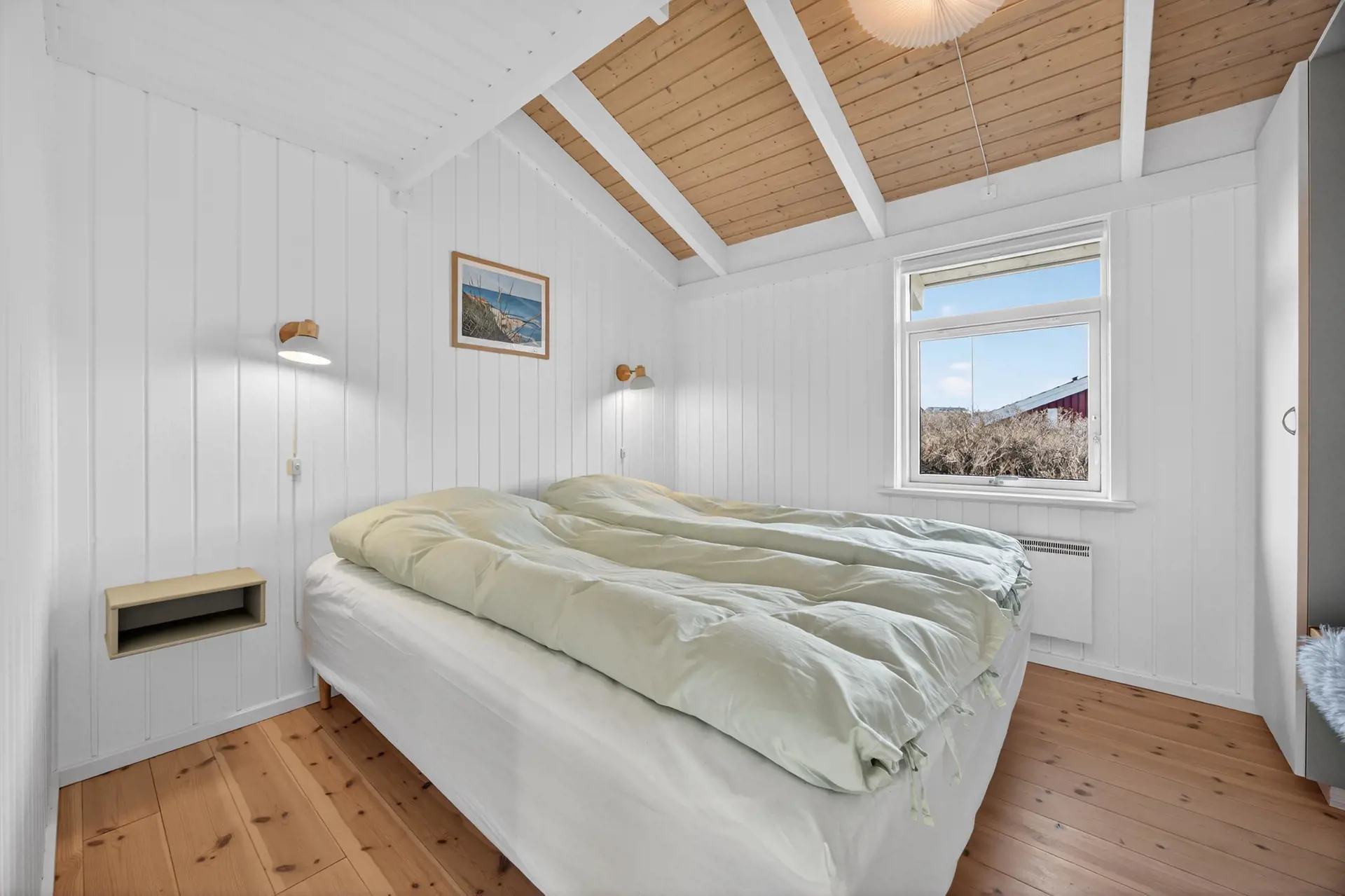 Das Haus wurde kürzlich renoviert und präsentiert sich hell, großzügig und besonders einladend. Sie betreten das Ferienhaus über eine kleine Eingangsdiele, von der aus ein Flur zu den zwei hellen Schlafzimmern sowie zum Badezimmer mit Dusche und Waschmaschine führt.