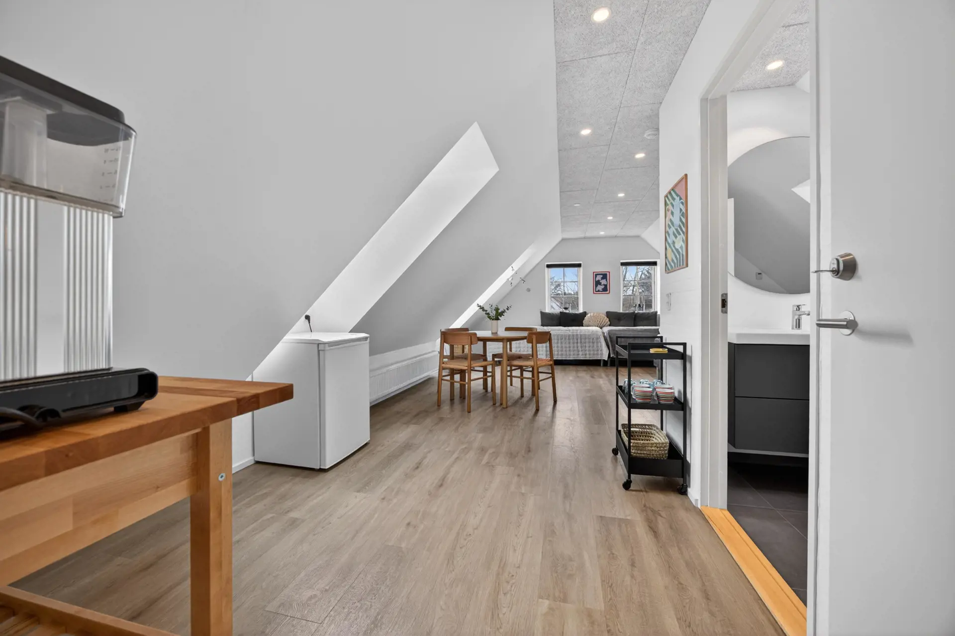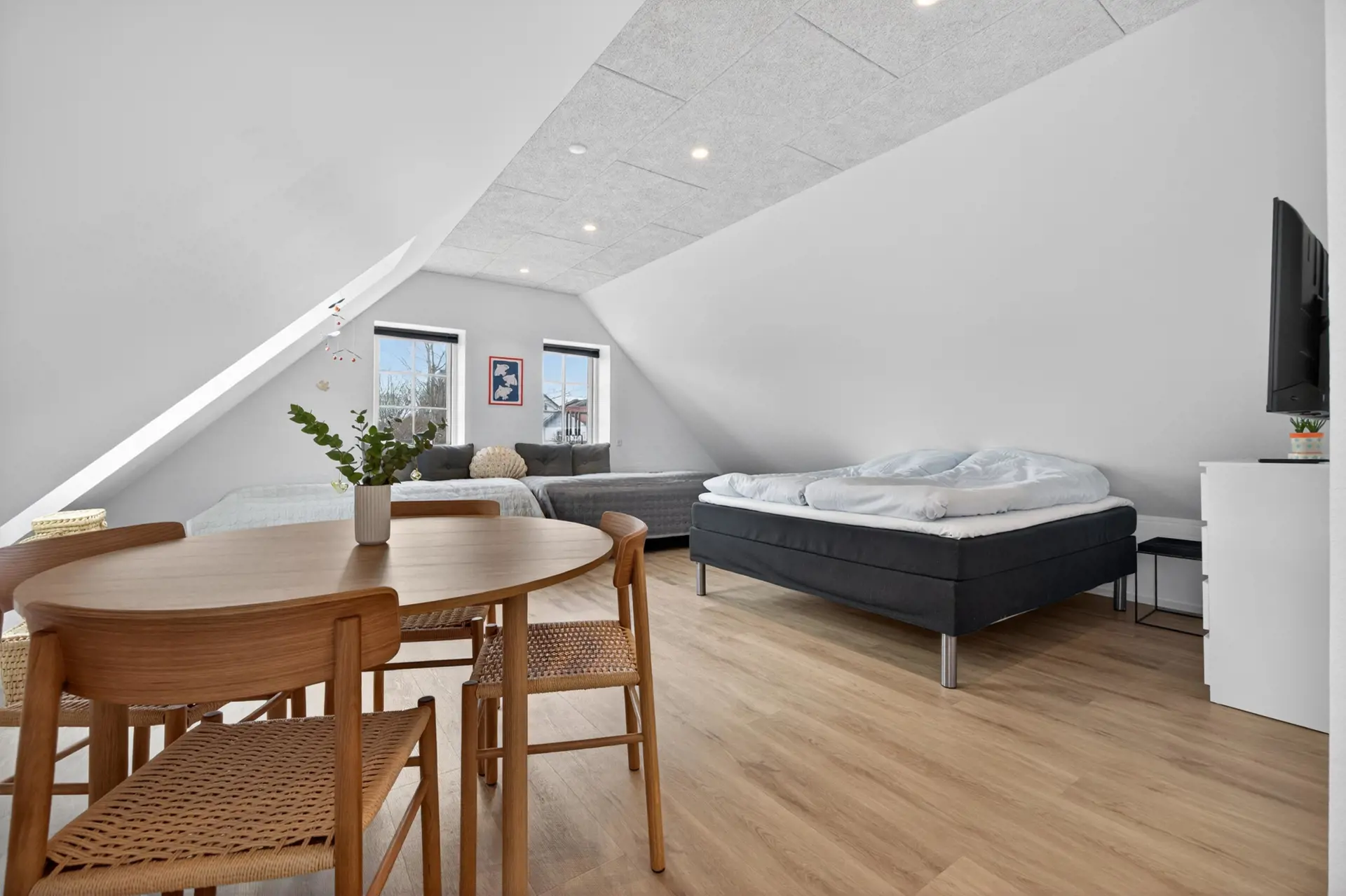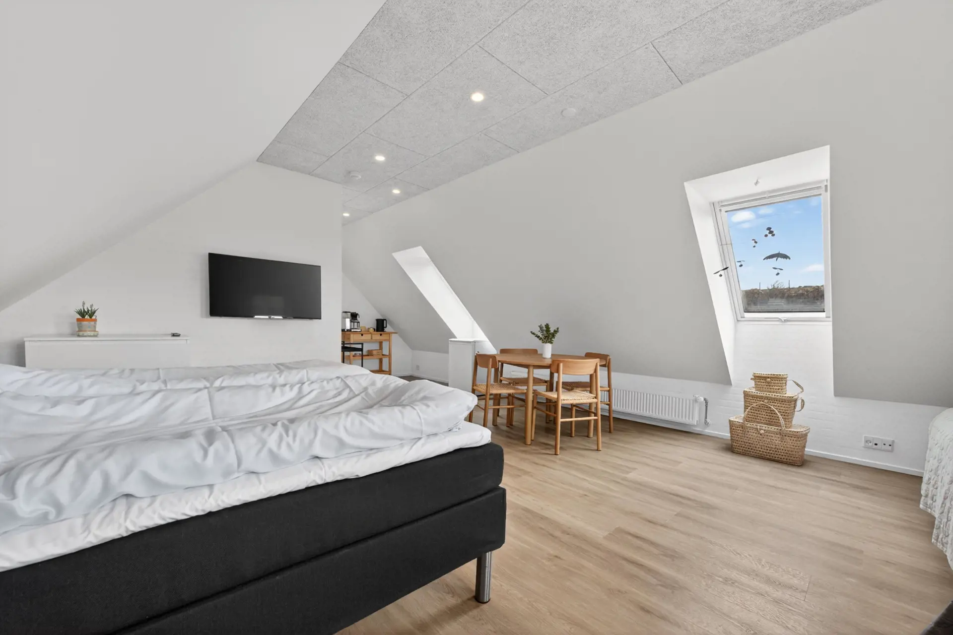 Die Wohnung ist einfach und funktional eingerichtet, wobei Wohnen, Essen und Schlafen in einem Raum vereint sind, der Ruhe und Gemütlichkeit ausstrahlt. Es gibt einen kleinen Essbereich sowie eine praktische Teeküche, in der Sie sich einen Kaffee oder eine kleine Mahlzeit zubereiten können.