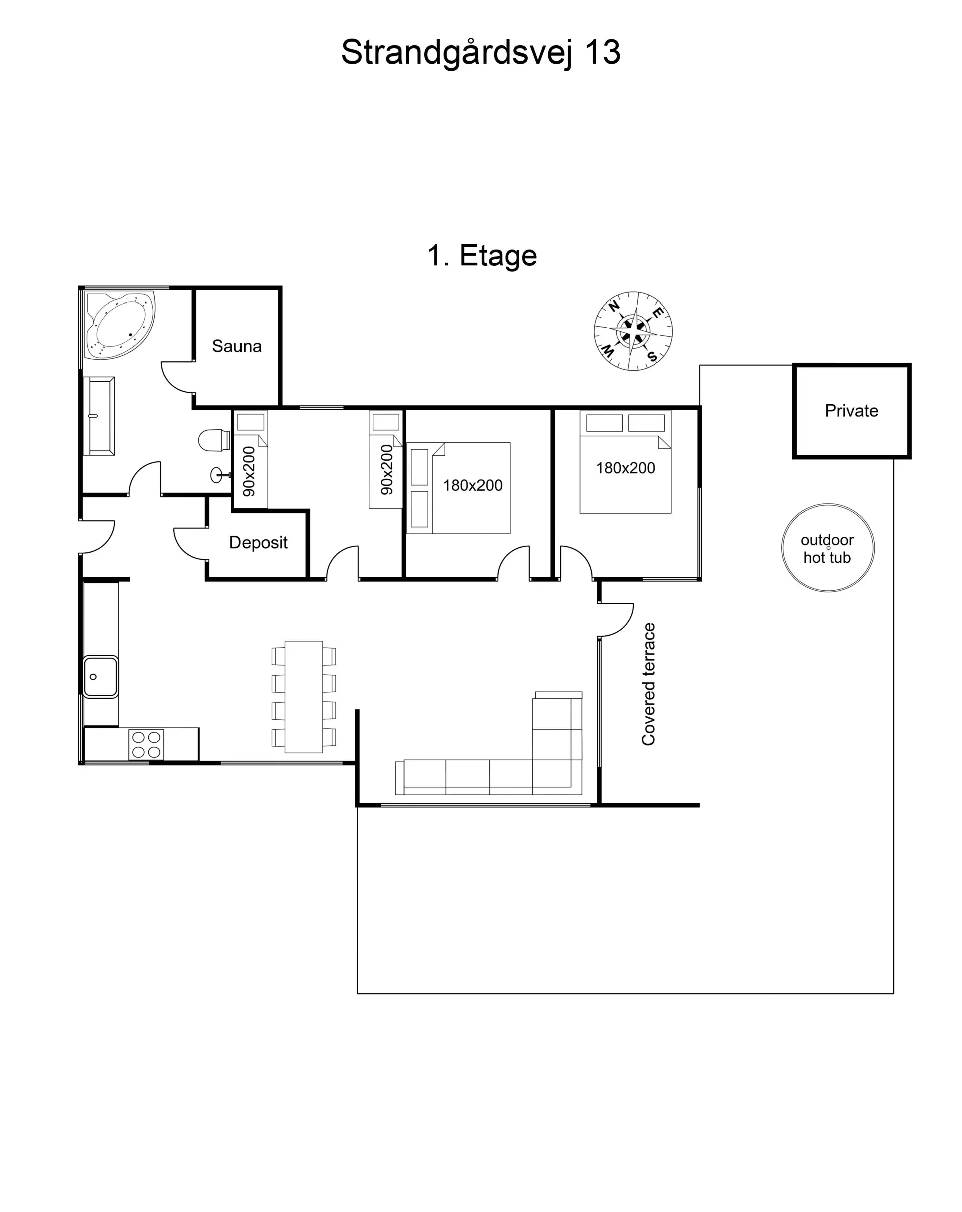 Draußen erwarten Sie mehrere gemütliche Terrassen, auf denen Sie die Sonne von morgens bis abends genießen können. Die überdachte Terrasse lädt auch bei kühlerem Wetter zum Verweilen ein – und das herrliche Wildnisbad unter freiem Himmel sorgt für pure Entspannung. Danach können Sie sich auf einer Sonnenliege ausstrecken und die Ruhe in einer der vielen windgeschützten Ecken rund ums Haus genießen.