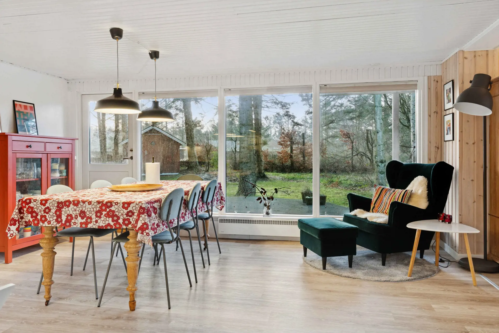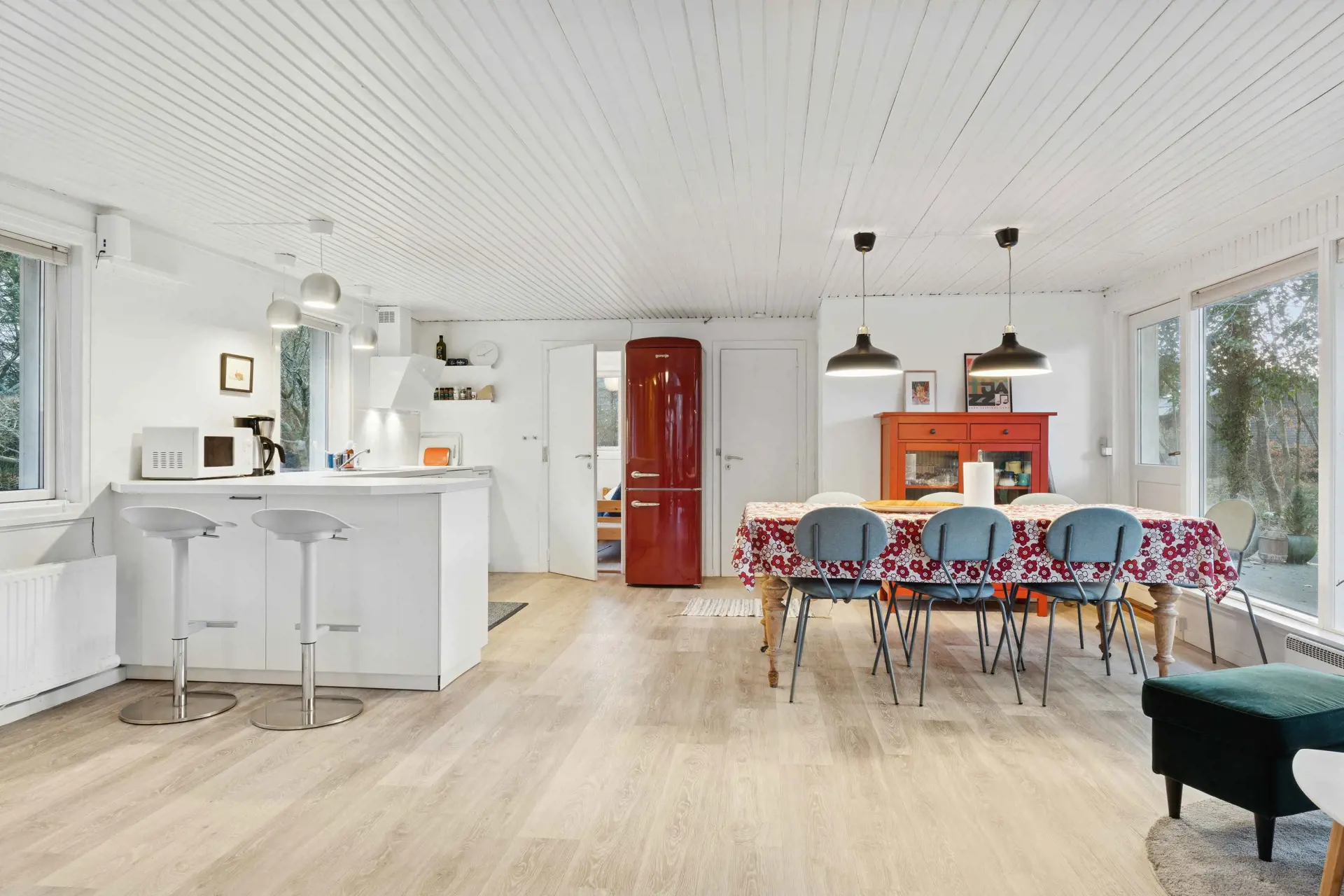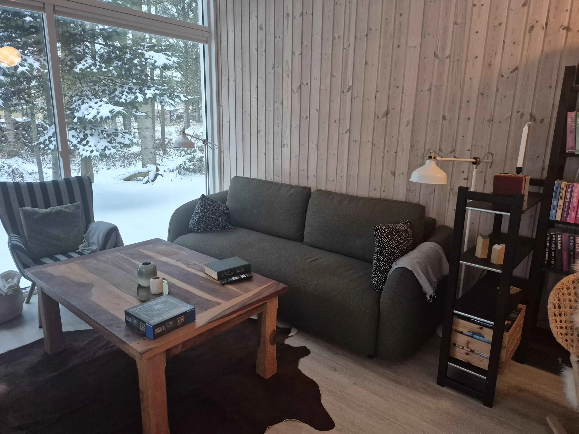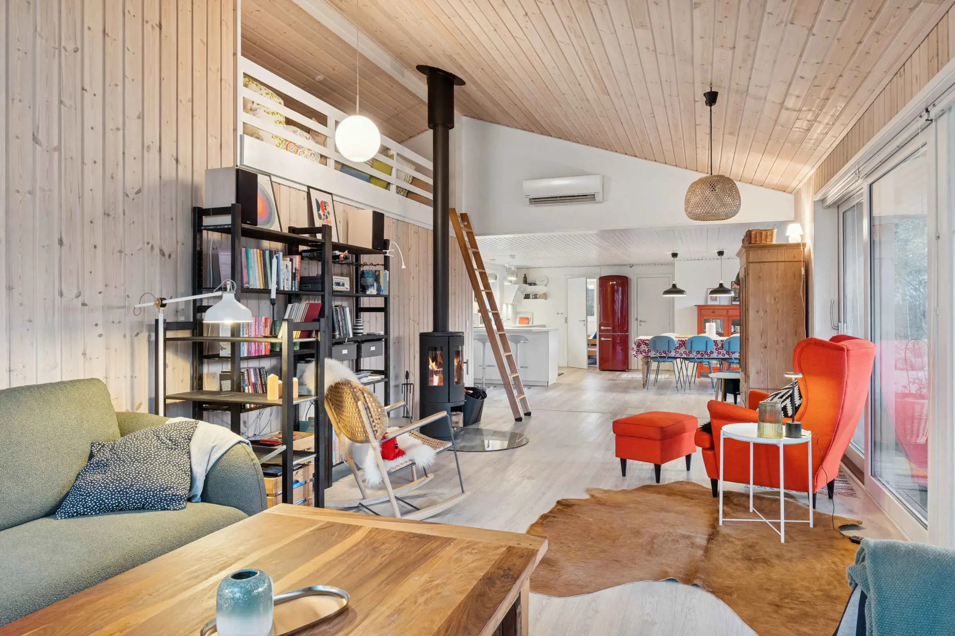 Das Haus ist 116 m² groß und besteht aus einem ursprünglichen, renovierten Teil von 1969 und einem Neubau von 2014. Man betritt das Haus durch den Hauswirtschaftsraum, wo sich auf einer Seite ein großes Schlafzimmer mit Doppelbett (180x200) und ein Badezimmer befinden, und auf der anderen Seite die Küche mit Essbereich. Die Küche stammt aus dem Jahr 2023 und bietet Platz für 6 Personen. Vom Essbereich gelangt man in das geräumige und gemütliche Wohnzimmer mit Holzofen und Sitzecke. Bücher und Spiele stehen zur Verfügung, ebenso eine gemütliche Schlafempore. Vom Wohnzimmer und Essbereich führt der Zugang auf eine teilweise überdachte Terrasse.