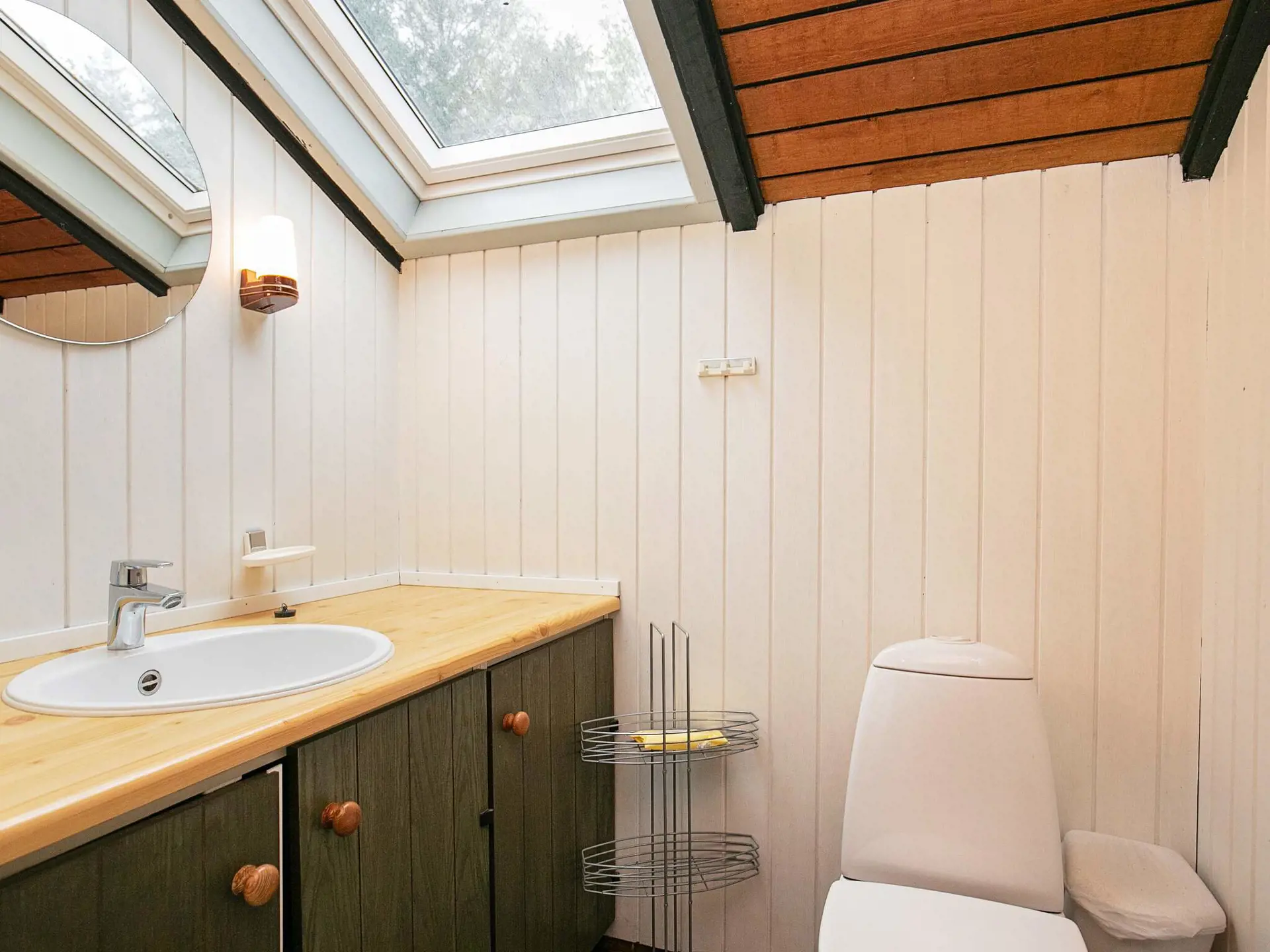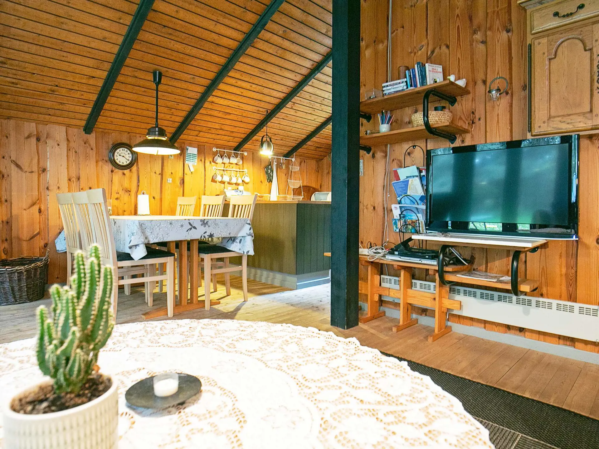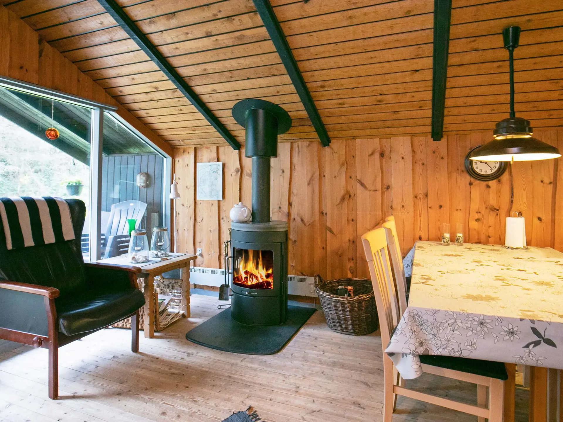 Das Ferienhaus hat einen offenen Küchen-/Essbereich für das Familienleben. Die schönen Holzwände des Hauses tragen maßgeblich zur Gemütlichkeit im Haus bei. Es gibt eine energieeffiziente Wärmepumpe im Haus. Zudem spendet im Wohnbereich der Holzofen bei Bedarf mollige Wärme.