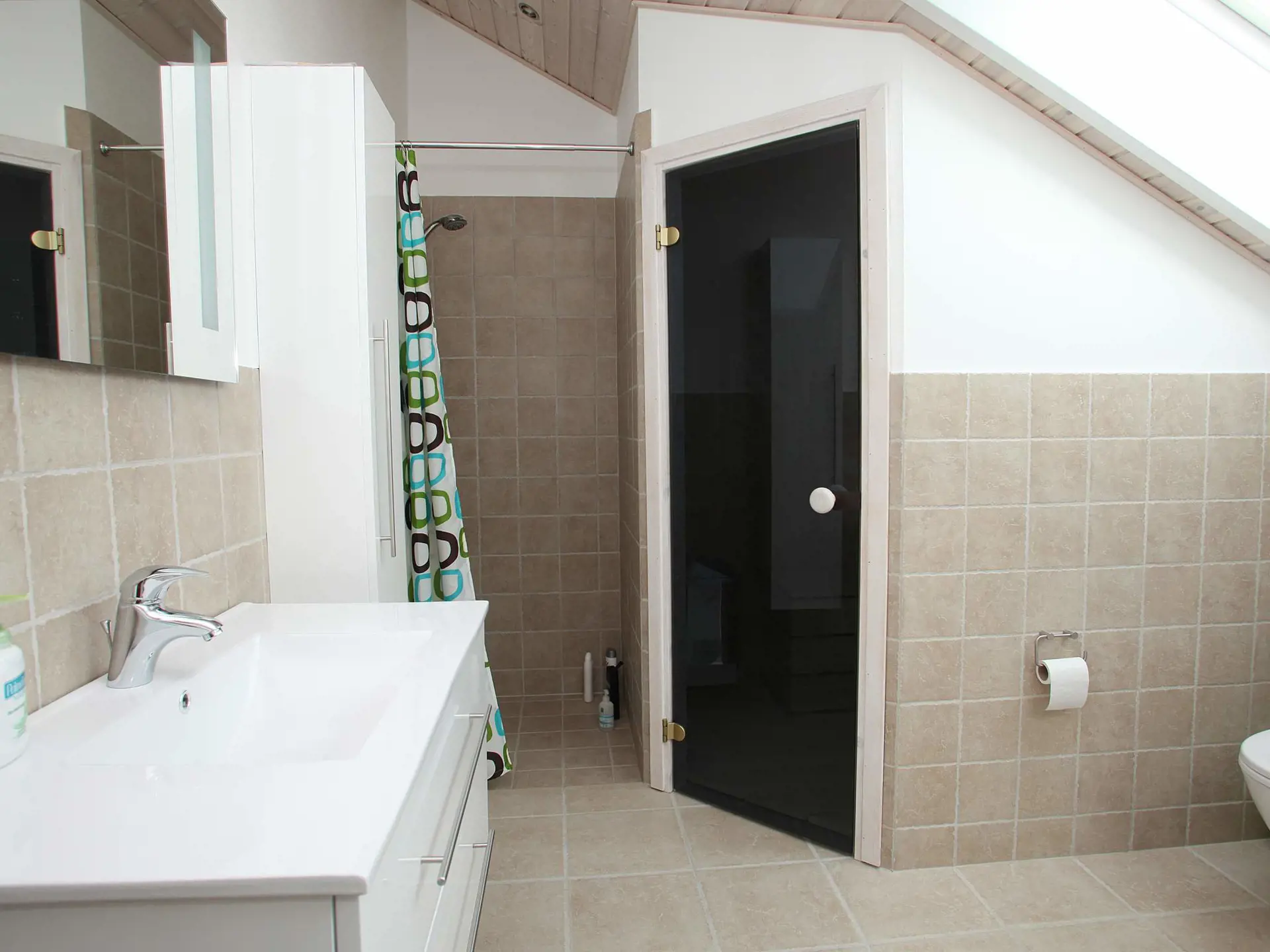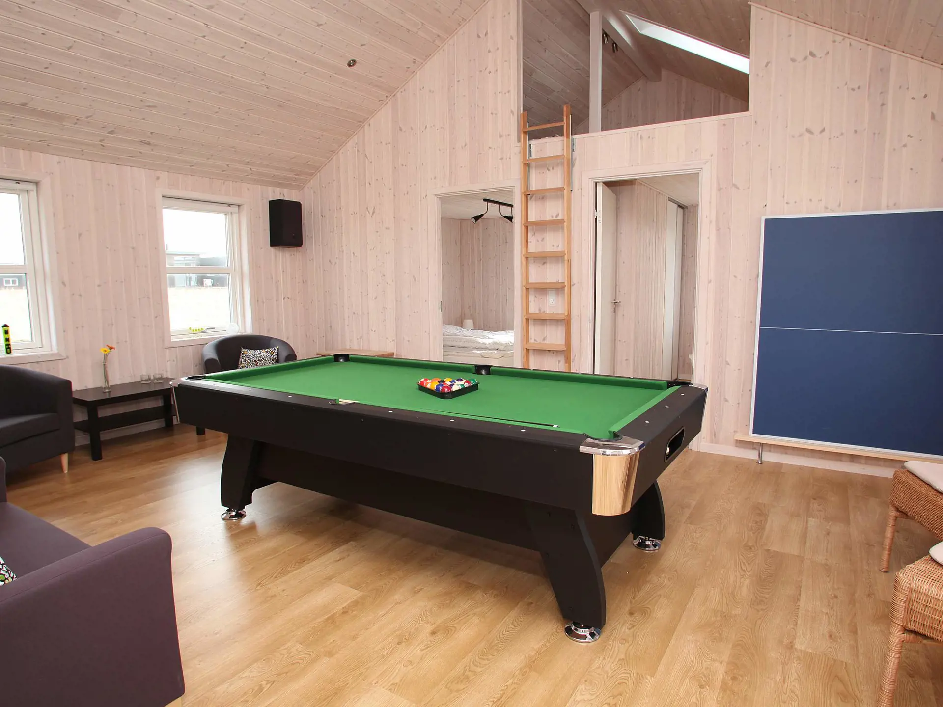 Im Aktivitätsraum finden Sie Billard, Tischtennis, Nintendo Wii und extra TV mit DVD-Spieler sowie Stereoanlage mit CD-Spieler vor. Auch auf dem Hems gibt es einen Fernseher (ohne SAT-Empfang) mit DVD-Spieler. Das Badezimmer ist mit 2-Personen Whirlpool mit Radio und Beleuchtung sowie Sauna ausgestattet. Das gesamte Haus hat Fußbodenheizung, die durch Erdwärme gespeist wird, was gemeinsam mit der guten Isolierung die Nebenkosten niedrig hält. Die Einrichtung ist hell und freundlich und strahlt Gemütlichkeit aus. Große Fensterflächen sorgen für einen guten Lichteinfall und lassen das Haus gemeinsam mit den hohen Dachschrägen besonders hell und geräumig erscheinen. Rund 100 m² Terrassenfläche, teilweise überdacht, umgeben das Haus. Das Grundstück liegt hoch und bietet Ausblick auf die umgebende Naturlandschaft.