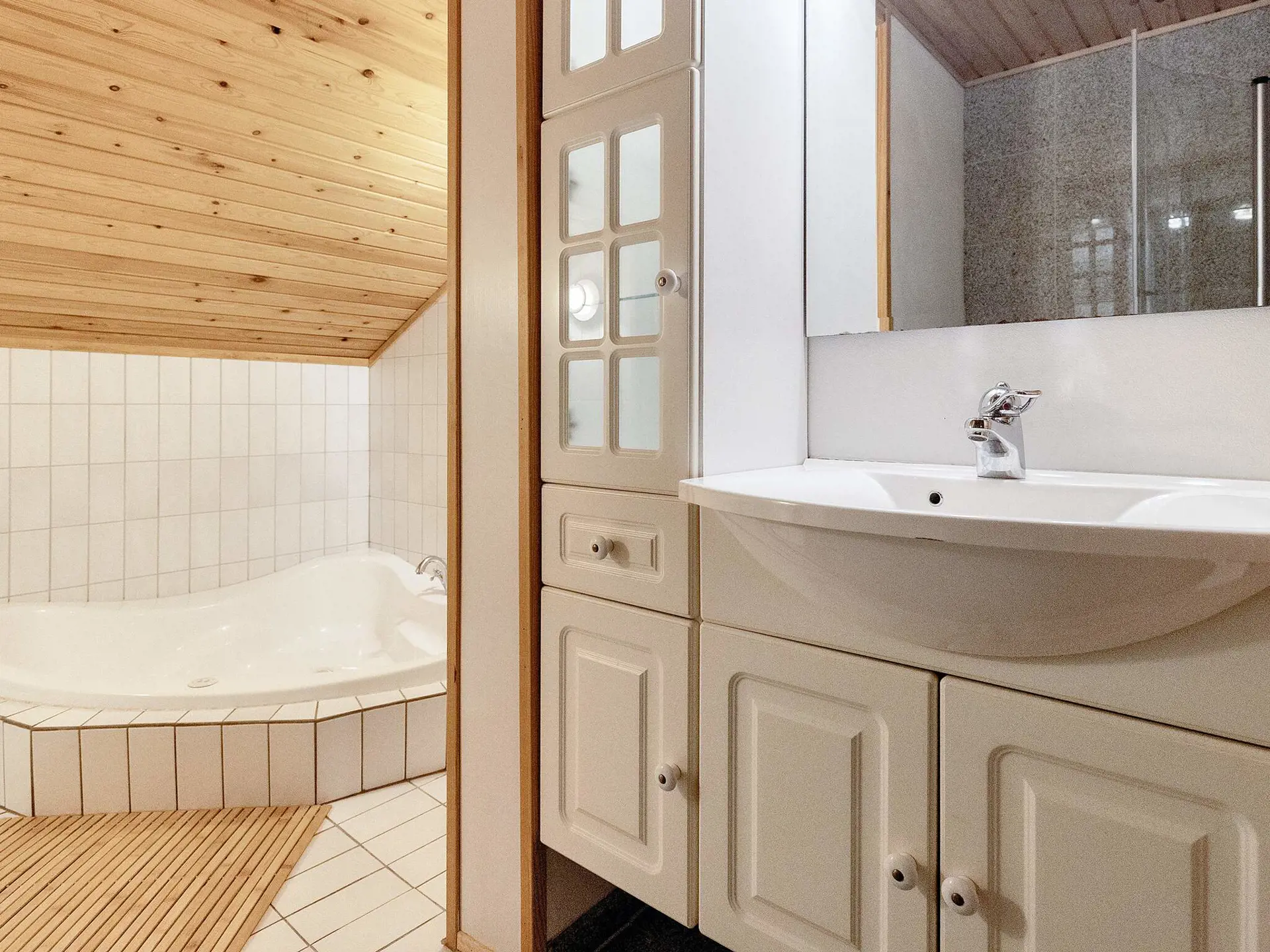 Das Ferienhaus hat ein schönes Badezimmer mit eingelassener Whirlwanne über Ecke sowie Zugang zur Sauna, Ablagefläche und Duschkabine mit Glastüren. Die Küche steht in offener Verbindung mit dem Wohnzimmer, wo es u.a. einen Kaminofen für die kühleren Abende gibt. Im Haus zudem vier Schlafzimmer, aufgeteilt in drei Zimmer mit Doppelbett und eines mit Etagenbett mit zwei Kojen.