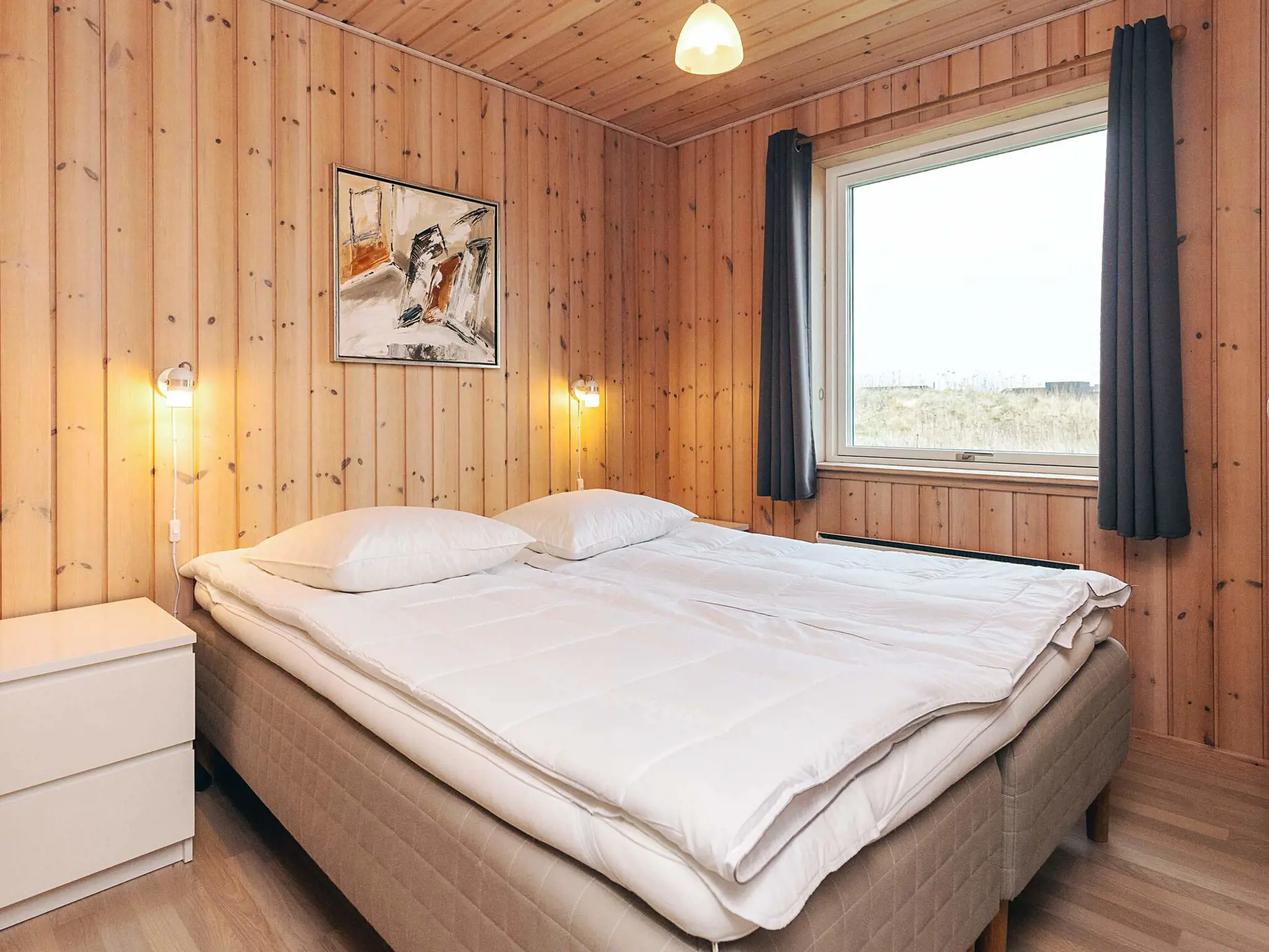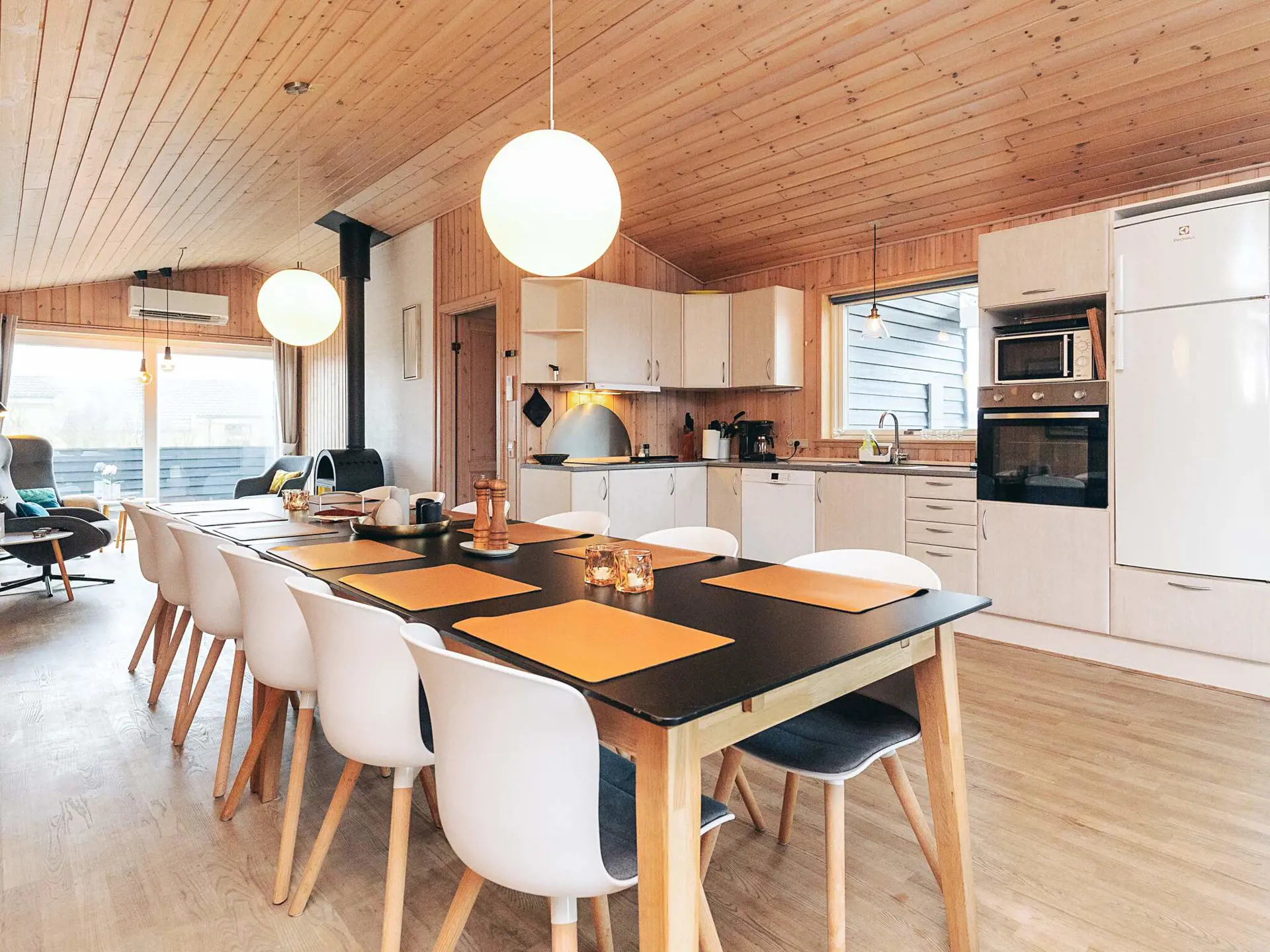 Das helle, geräumige Ferienhaus hat eine wohnliche Atmosphäre und eine schöne Inneneinrichtung. Der große Raum mit Wohnzimmer, Essbereich und offener Küche ermöglicht es, alle Aufgaben des Urlaubs gemeinsam zu erledigen. Es gibt auch viel Platz für Gemütlichkeit und Entspannung. In den Wintermonaten verfügen diese Räume über eine Fußbodenheizung. Das Wohnzimmer stellt sowohl einen Fernseher als auch einen Holzofen bereit. Der größte Teil des Hauses ist mit Holzböden ausgelegt. Mit Holzofen und Wärmepumpe im Haus ist der Verbrauch zudem energieeffizient.