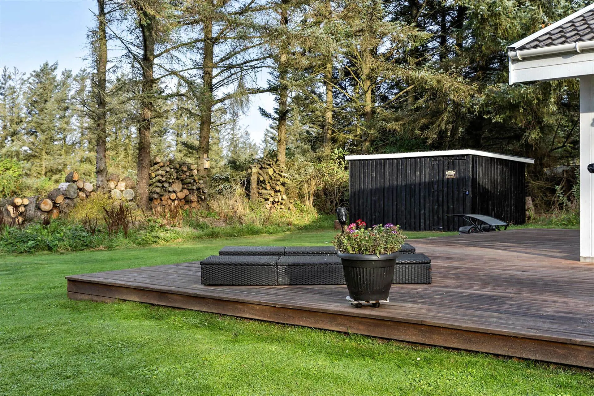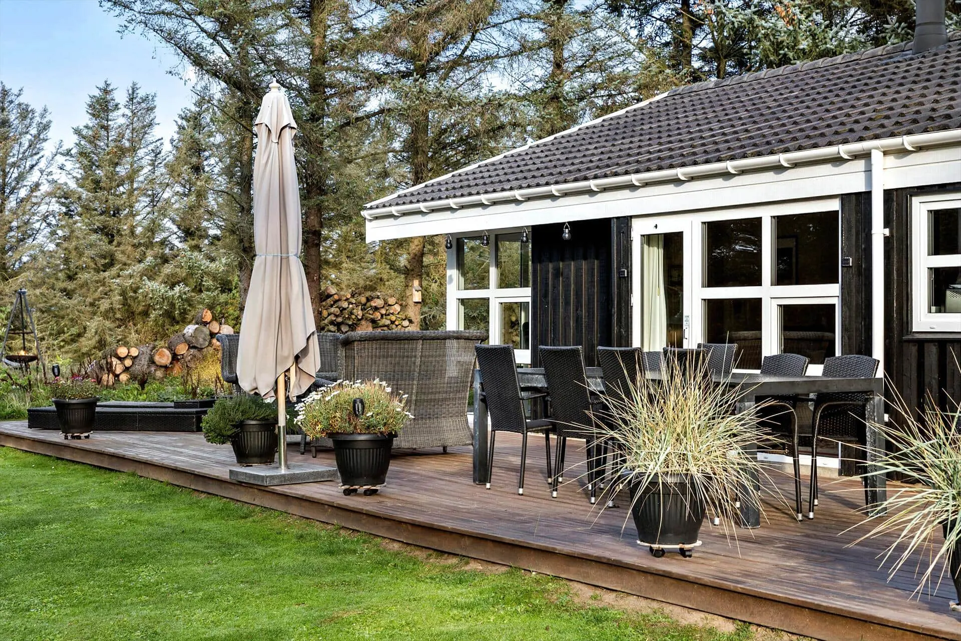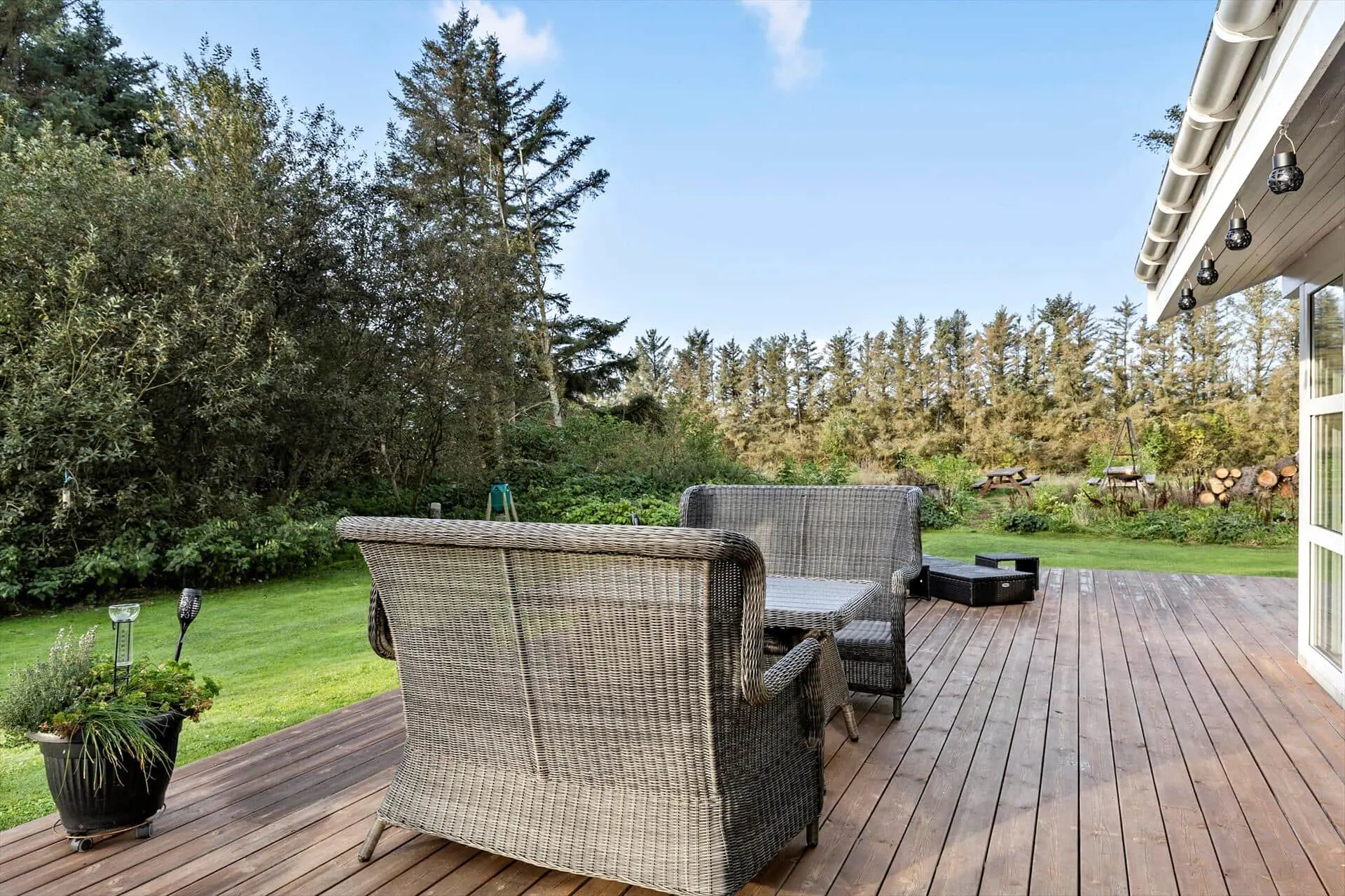 Vom Wohnraum gelangen Sie hinaus auf eine große Holzterrasse, auf der Sie sich bei schönem Sommerwetter bestens erholen werden. Die Terrasse ist angenehm sonnig. Gartenmöbel, Liegestühle, ein Sonnenschirm und ein Grill sind vorhanden. Das Grundstück wird durch eine Randbepflanzung abgeschirmt.