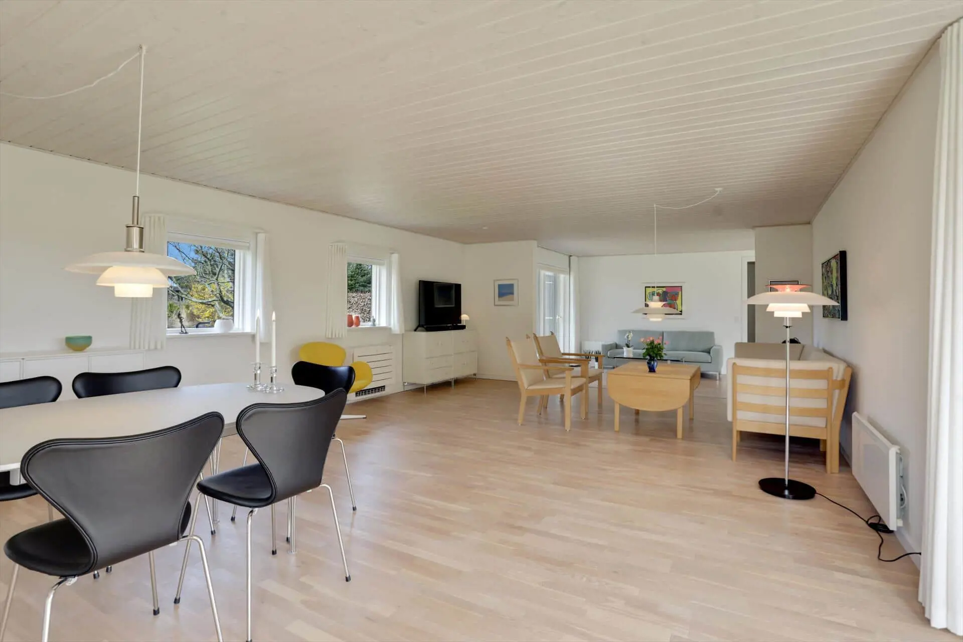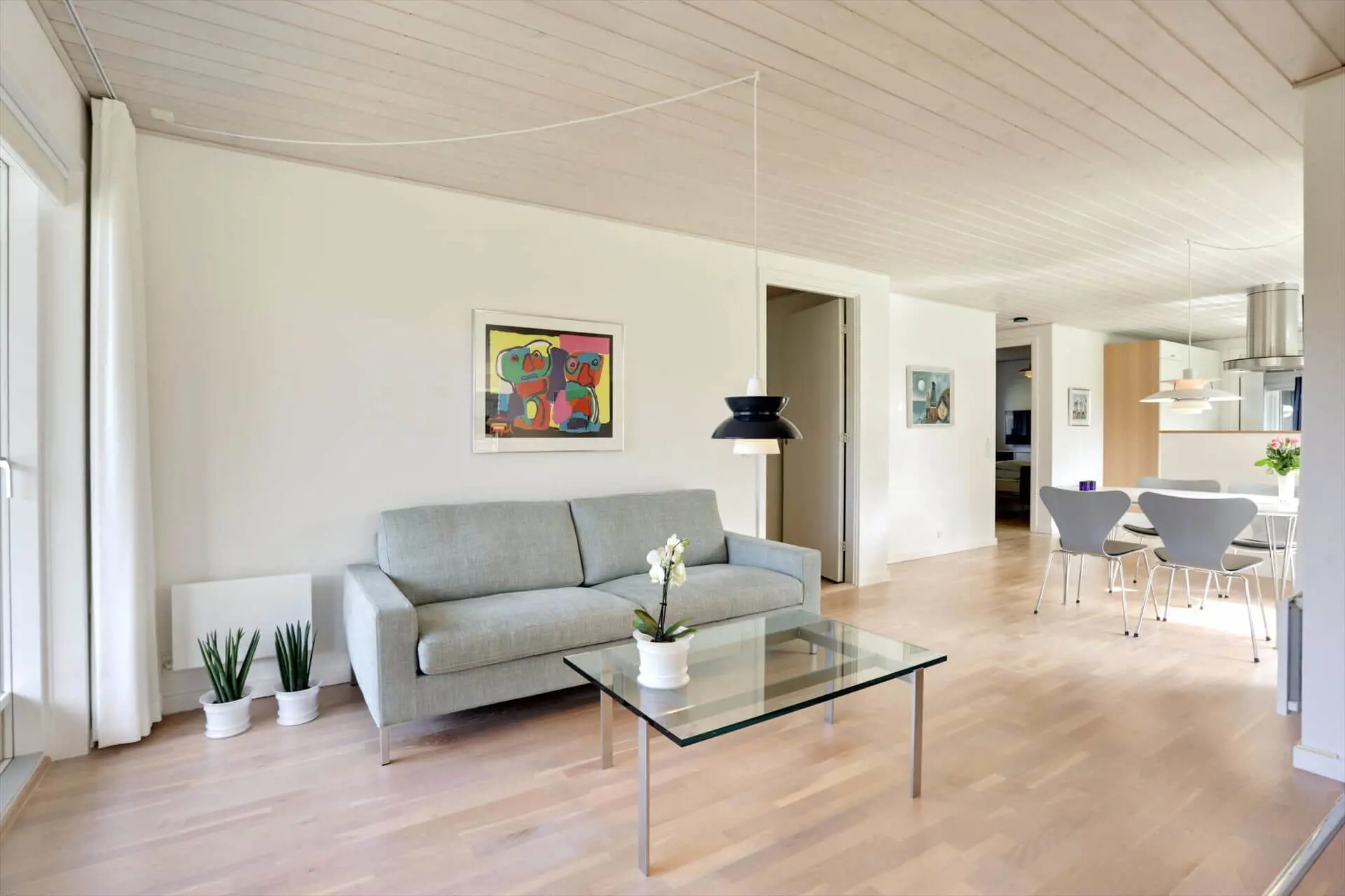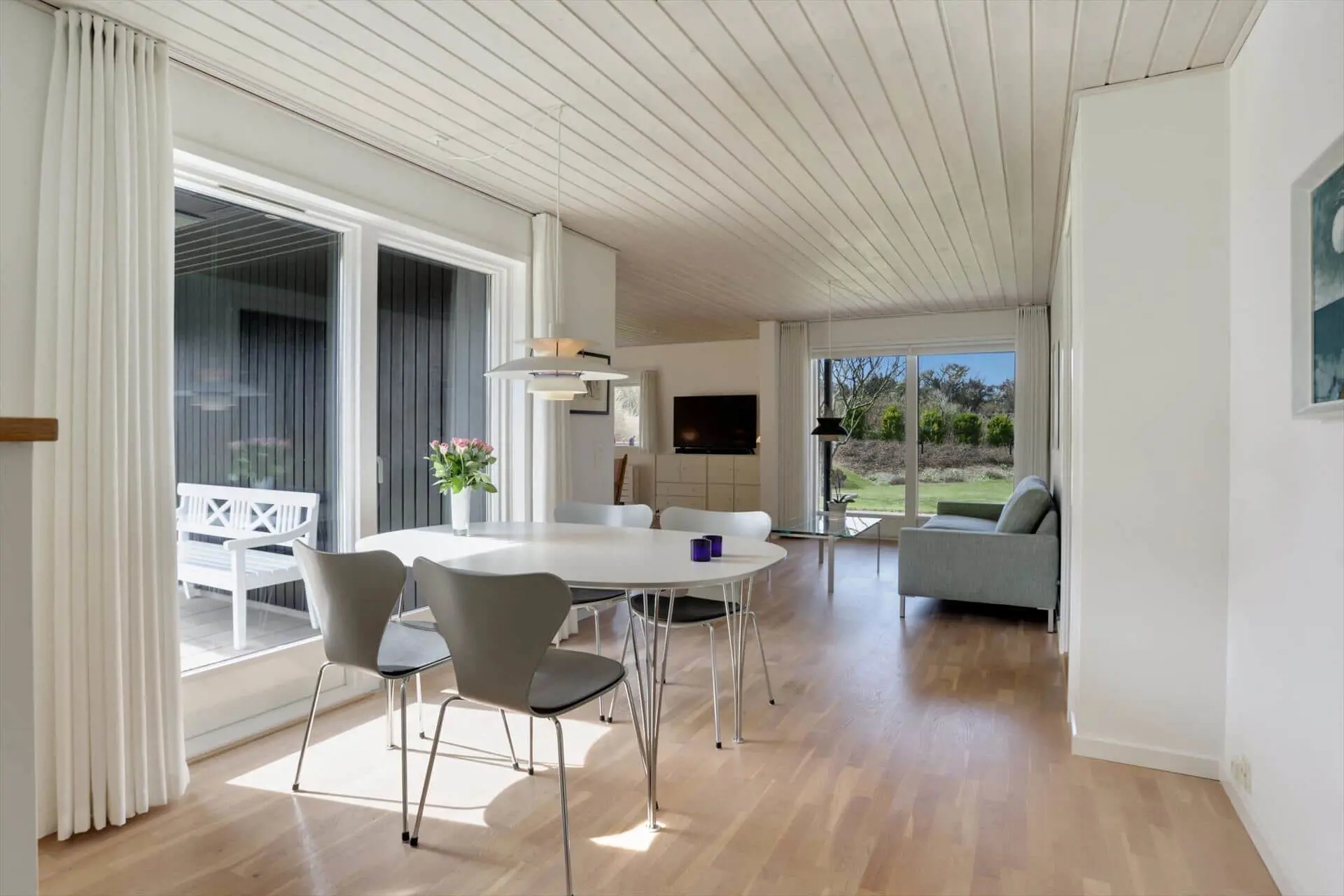 Das Ferienhaus bietet eine helle und großzügige Atmosphäre, in der das Beisammensein im Mittelpunkt steht. Das große Wohnzimmer ist der natürliche Treffpunkt des Hauses – mit Platz für Entspannung und gemeinsame Mahlzeiten. Hier kannst du dich nach einem Tag am Strand auf dem Sofa zurücklehnen, während die Abendsonne golden durch die Fenster scheint. Die offene Verbindung zur Küche macht es leicht, zusammen zu sein – auch während des Kochens. Das Haus verfügt über zwei Badezimmer, was für hohen Komfort sorgt, wenn Familie oder Freunde gemeinsam Urlaub machen, und ein praktischer Hauswirtschaftsraum mit Waschmaschine und Trockner erleichtert die täglichen Aufgaben. Alles ist in einem schlichten, funktionalen Stil eingerichtet, sodass du dich vom ersten Tag an wie zu Hause fühlst.