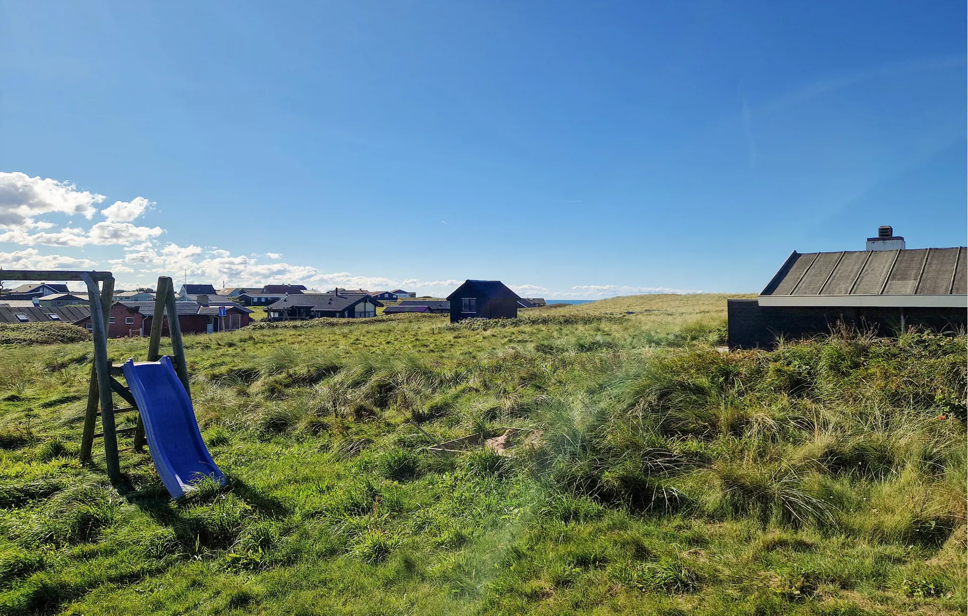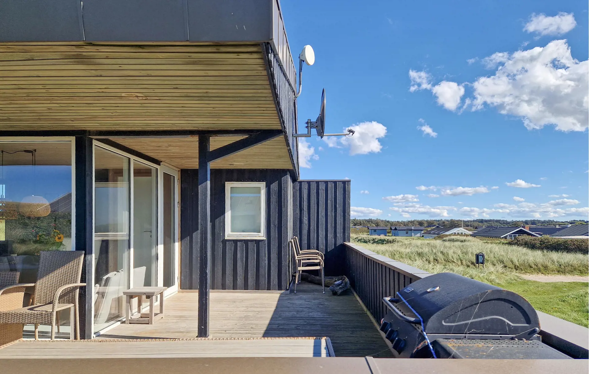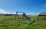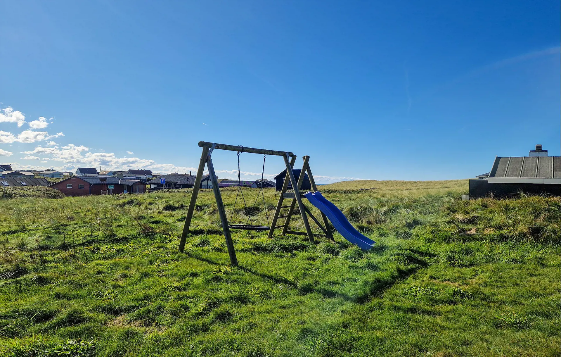 Treten Sie hinaus auf die großzügigen Holzterrassen, die das Haus umgeben. Wählen Sie Ihren Lieblingsplatz – in der Sonne oder im Schatten unter dem überdachten Bereich – und entspannen Sie in den bequemen Gartenmöbeln. Lassen Sie die Kinder auf dem Spielplatz mit Schaukel und Rutsche toben, während Sie die Ruhe der Umgebung genießen.