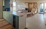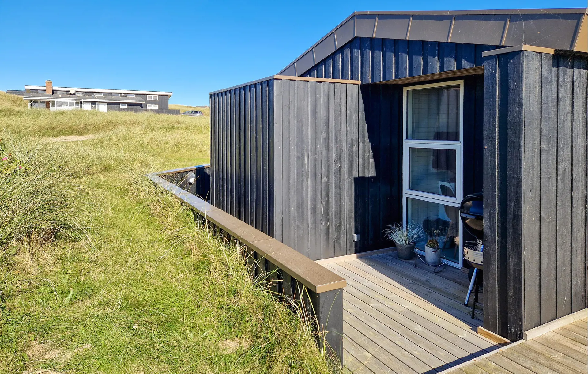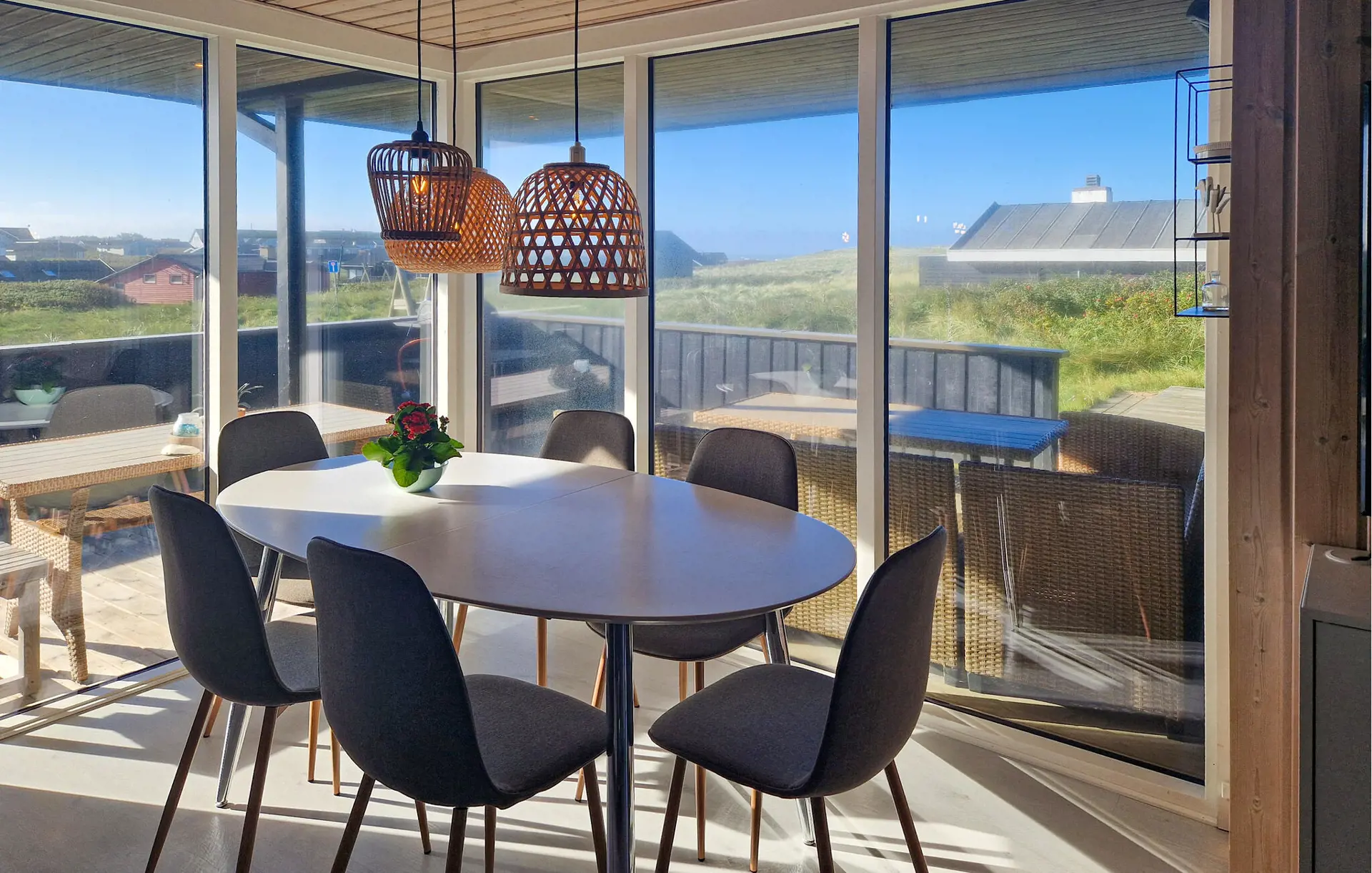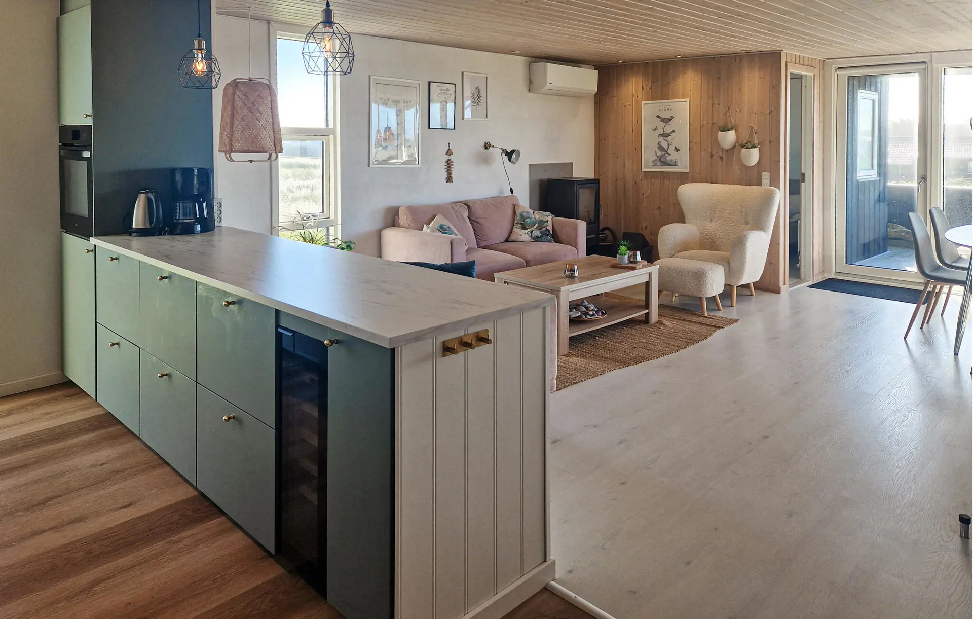 Ihr Ferienhaus ist der ideale Ort, um Ruhe, Natur und Komfort miteinander zu verbinden. Eingebettet in die nordjütländische Dünenlandschaft vereint es modernen Wohnkomfort mit skandinavischer Gemütlichkeit. Machen Sie es sich auf den stilvollen Sofas im Wohnraum gemütlich. Lassen Sie den Blick durch die großen Panoramafenster schweifen und genießen Sie das natürliche Licht, das den Raum durchflutet. Entfachen Sie den Kaminofen, lesen Sie ein Buch im bequemen Sessel oder schauen Sie gemeinsam einen Film auf dem großen Fernseher. Bereiten Sie Ihre Mahlzeiten in der modernen Küche zu und genießen Sie sie anschließend am Esstisch mit Aussicht auf die Dünen. Entspannen Sie am Abend im Whirlpool oder in der Sauna und spüren Sie, wie die Anspannung des Alltags schwindet.