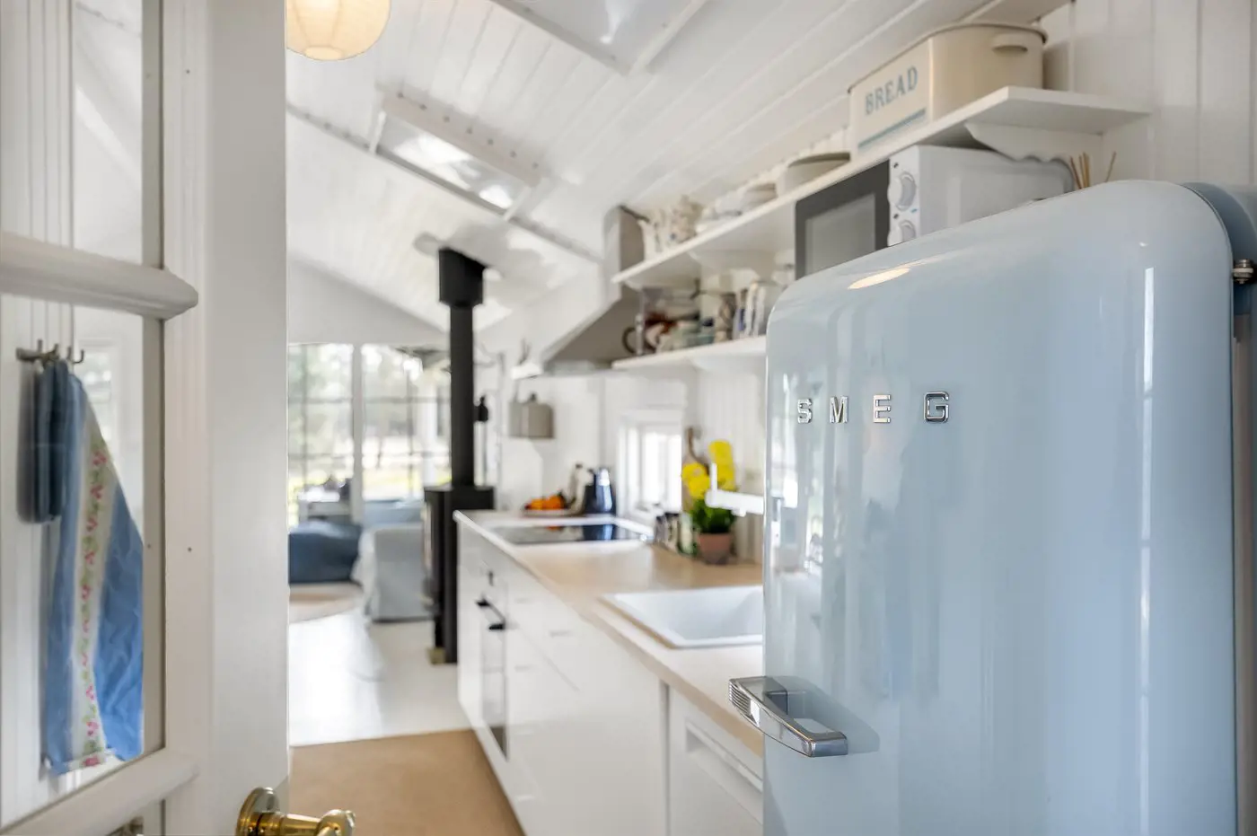 Die Küche ist mit Kühlschrank ausgestattet. Außerdem gibt es 4 Induktions-Kochzonen, Umluftofen, Mikrowelle sowie Geschirrspüler.