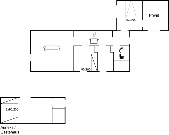Die Schlafplätze verteilen sich auf 3 Schlafräume. 2 Schlafplätze in einem Doppelbett. 3 Schlafplätze in Einzelbetten. 2 von diesen Schlafplätzen befinden sich im Gästehaus.