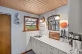 Die Küche ist mit Kühlschrank ausgestattet. Außerdem gibt es 4 Keramik-Kochfelder, Umluftofen, Mikrowelle.