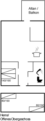 Es gibt einen Schlafraum. 2 Schlafplätze in einem Doppelbett. 2 Schlafplätze in Einzelbetten. 2 von diesen Schlafplätzen befinden sich im offenen Obergeschoss.