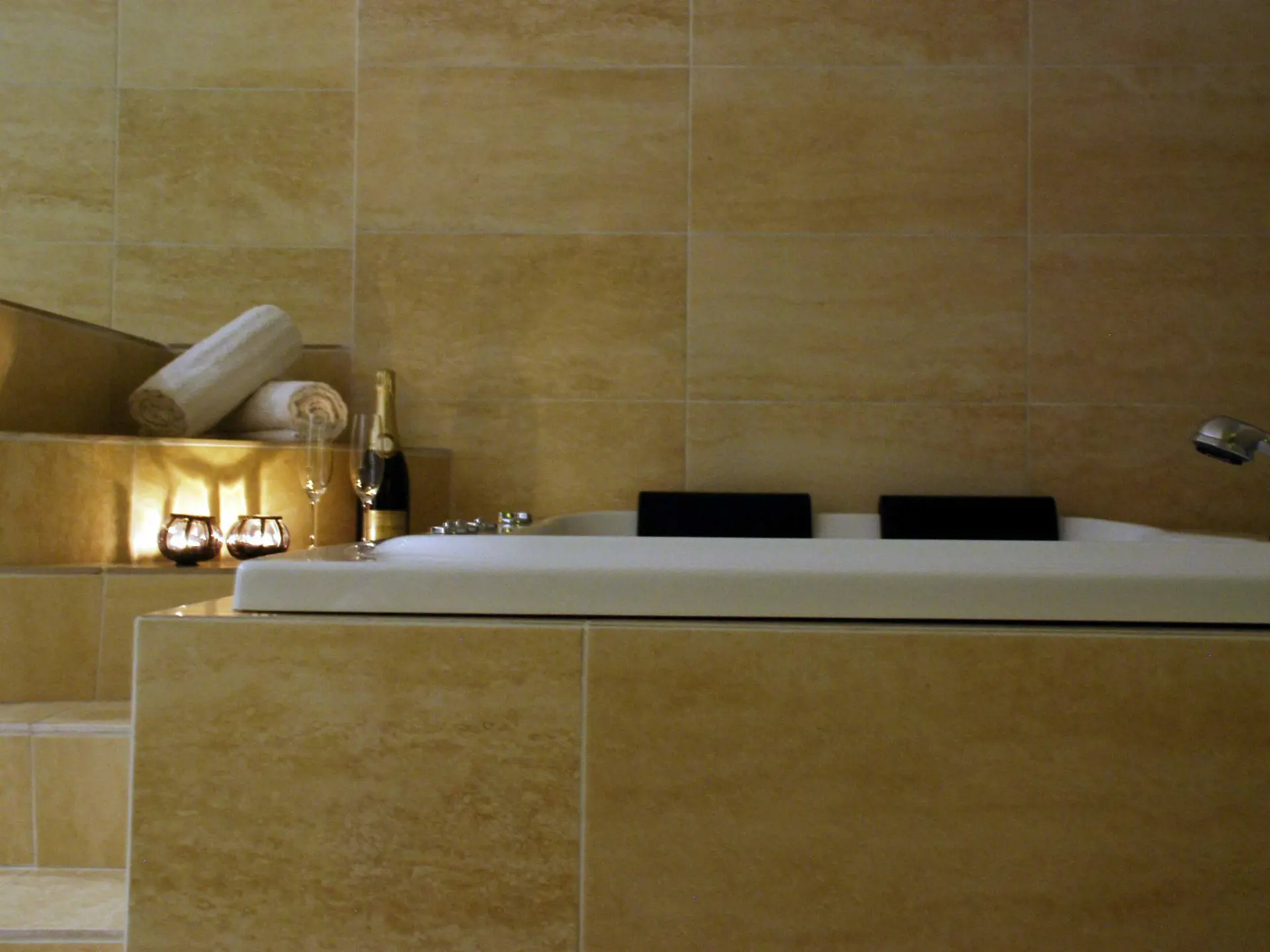 Das Ambiente im Poolbereich ist ein Kapitel für sich. Mit seiner Schieferwand und den schwarzblauen Fliesen als Verkleidung im Pool schweifen die Gedanken hier in Richtung eines tiefen, geheimnisvollen Bergsees am Fuße der Alpen ab.