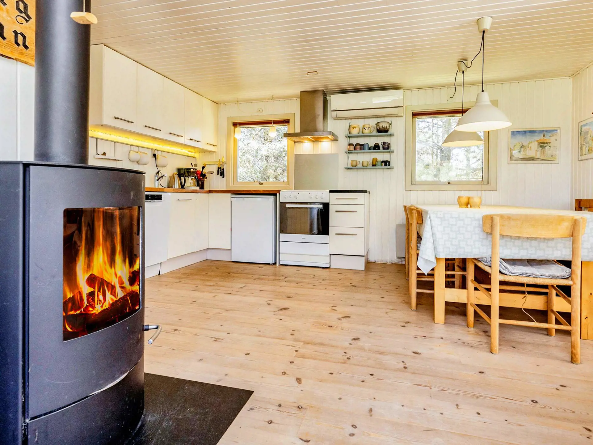 Innen bietet es insgesamt 8 Schlafplätze, verteilt auf ein Schlafzimmer mit Doppelbett, ein Zimmer mit zwei Einzelbetten und ein 3. Schlafzimmer mit 4 Kojen in zwei Etagenbetten. Darüber hinaus gibt es einen separaten Annex mit der Möglichkeit für 2 Zustellbetten. Badezimmer mit Dusche und Sauna.