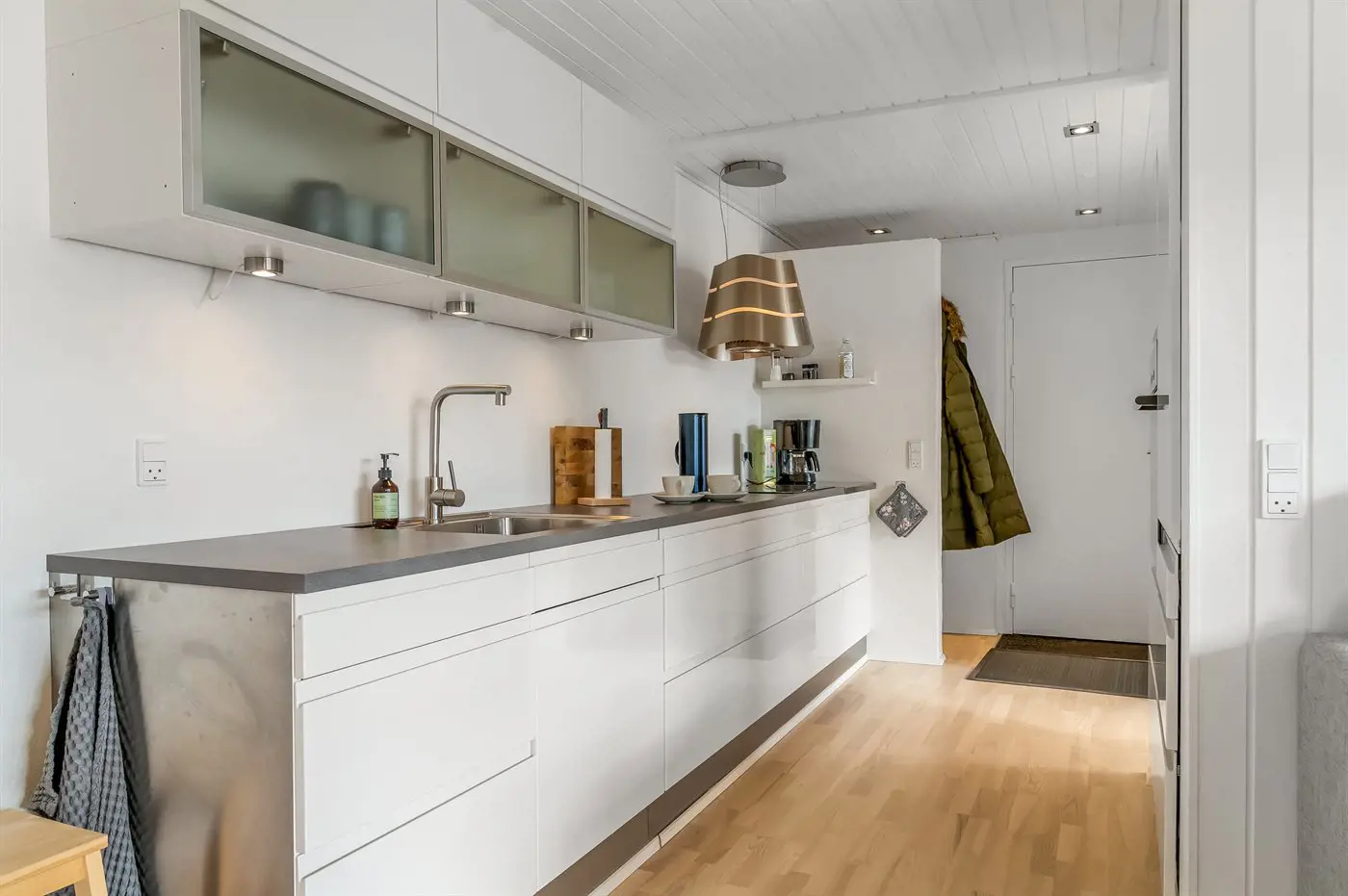Die Küche ist mit Kühlschrank ausgestattet. Außerdem gibt es 4 Induktions-Kochzonen, Umluftofen sowie Geschirrspüler.