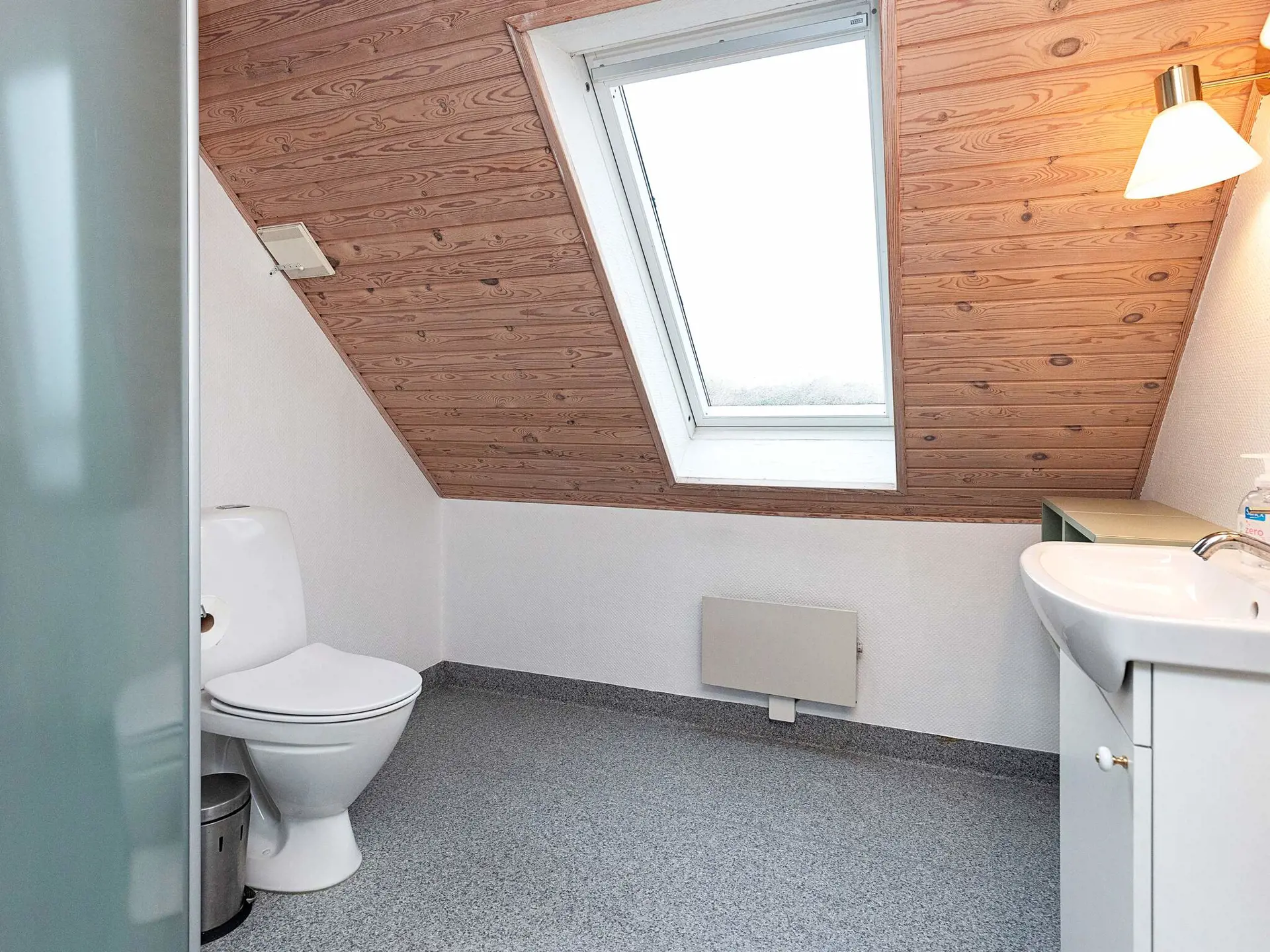 Das Ferienhaus bietet zwei Wohnebenen, wobei die untere Etage größtenteils aus einem gut ausgestatteten Küchen-/Wohnbereich mit Ess- und Sitzecke für das Familienleben besteht. Zudem ein Badezimmer mit Waschmaschine und Trockner, Flur und ein großes Schlafzimmer unten.