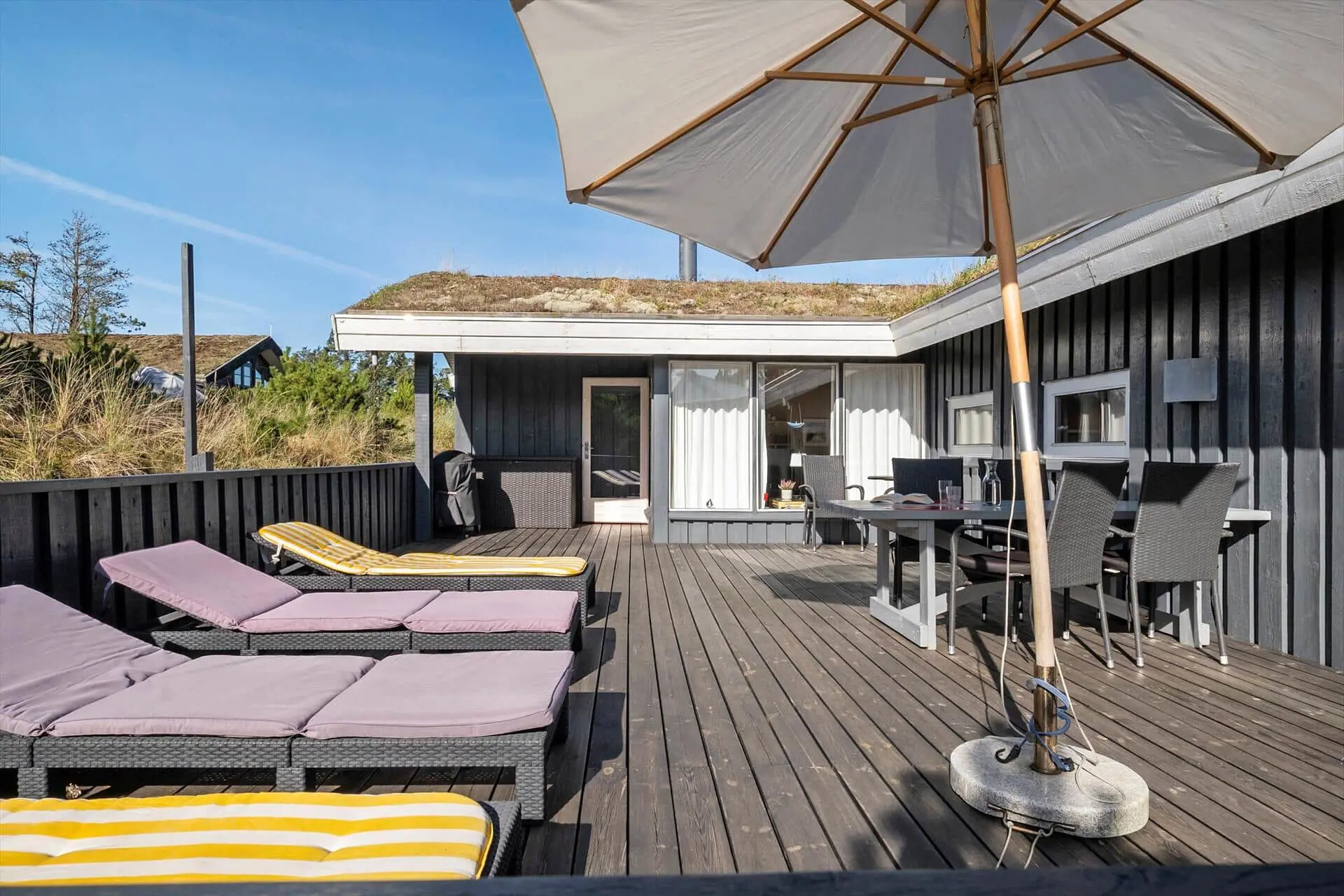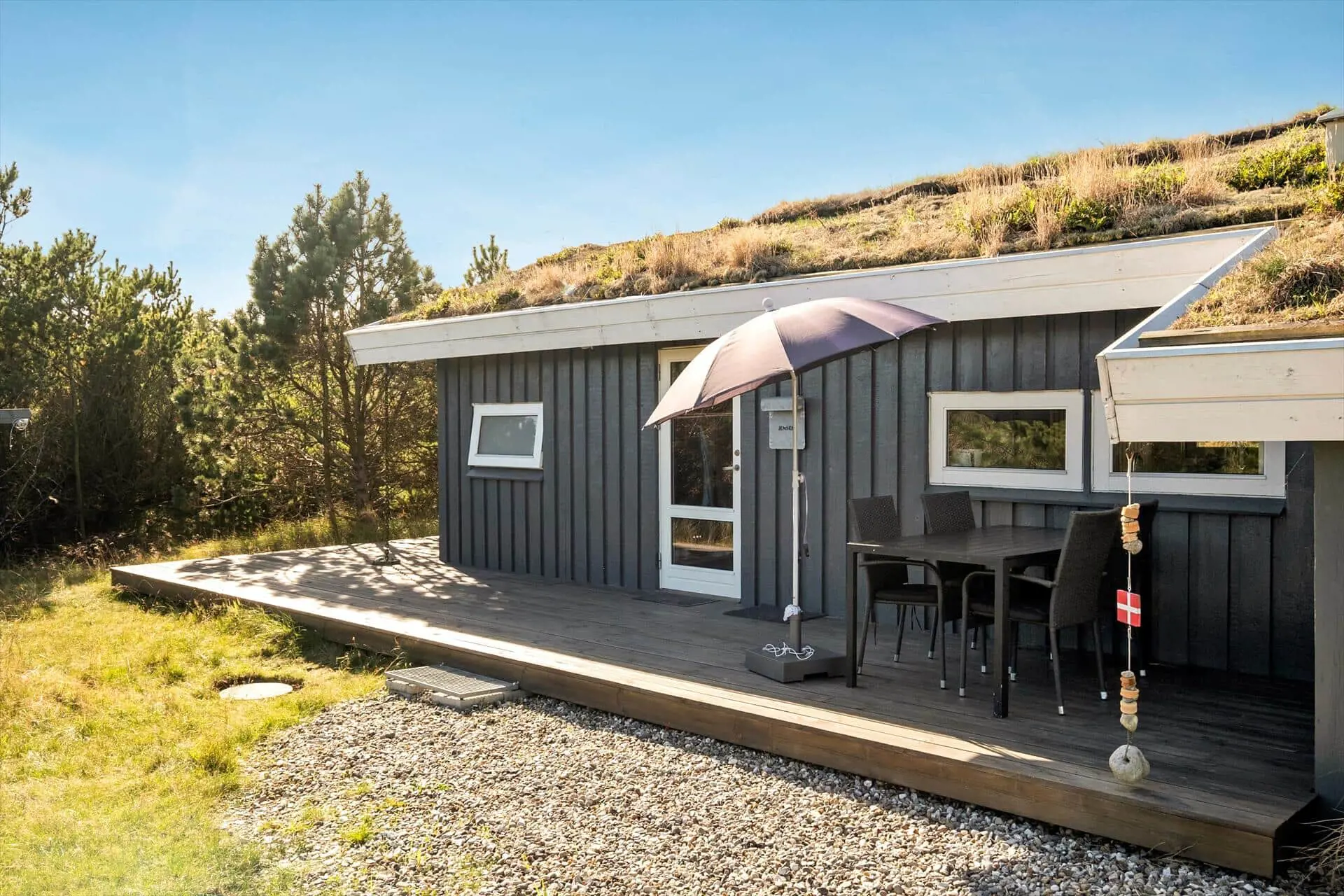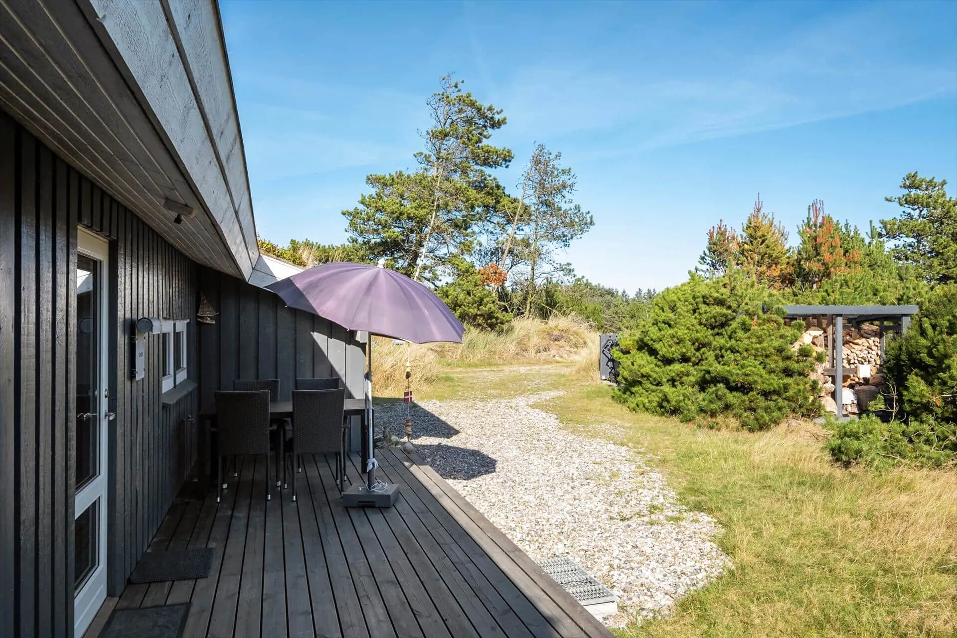 Draußen findest du die eingezäunte Terrasse, die die ideale Oase sowohl für Entspannung als auch für gemeinsames Beisammensein bietet. Der Terrassenbereich ist perfekt für sonnige Tage, und hier kannst du deinen Morgenkaffee genießen oder eine Pause im Schatten der Bäume machen. Der eingezäunte Innenhof bietet euch viel Privatsphäre, sodass ihr euch ohne Störungen entspannen könnt. Die idyllische Umgebung des Ferienhauses lädt zu langen Spaziergängen ein, bei denen ihr die vielen Wege durch den Wald und die Dünen erkunden könnt. Hier gibt es Platz für ruhige Momente sowie für aktive Erlebnisse, während ihr die einzigartige Natur in der Nähe genießt.