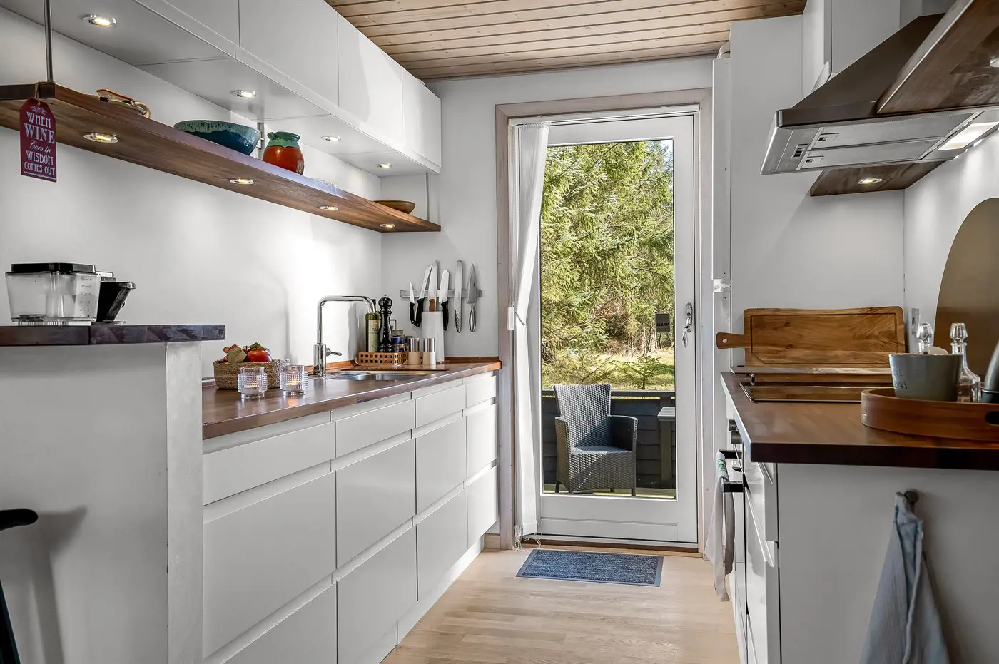 Die Küche ist mit Kühlschrank ausgestattet. Außerdem gibt es 4 Induktions-Kochzonen, Umluftofen, Mikrowelle sowie Geschirrspüler.