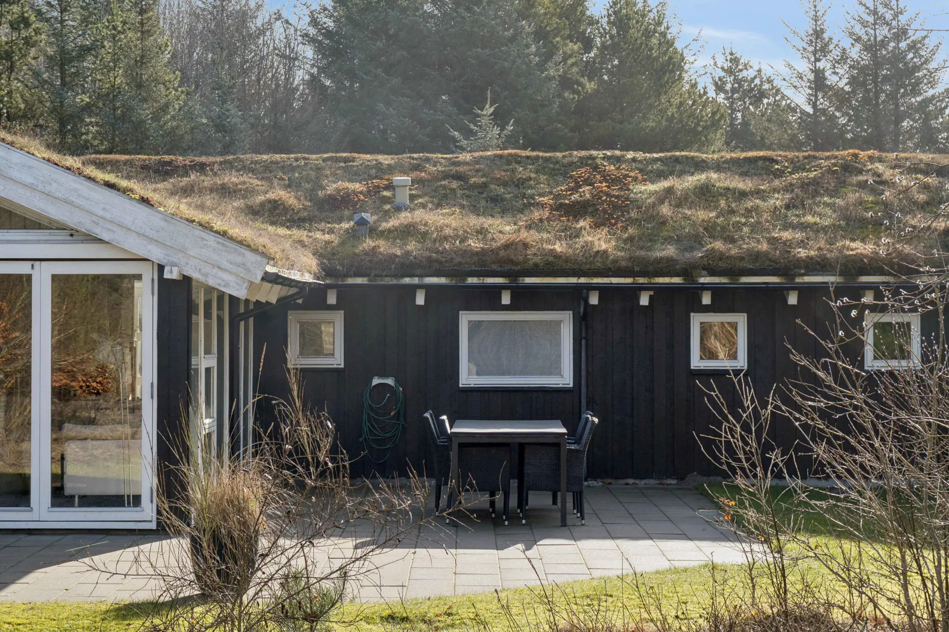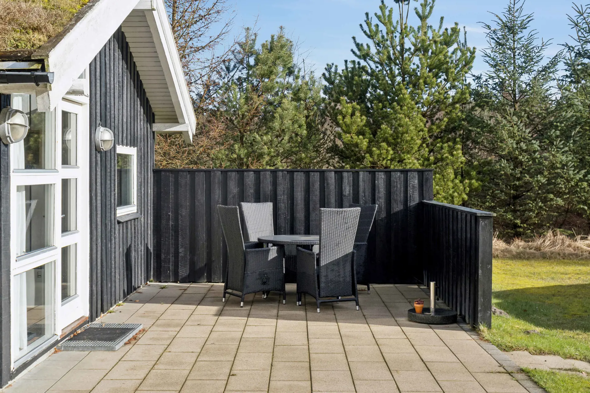Im Außenbereich gibt es Terrassen auf beiden Seiten des Hauses, sodass man der Sonne folgen kann. Das Grasdach fügt sich harmonisch in die Umgebung ein, und Haustiere sind erlaubt.
