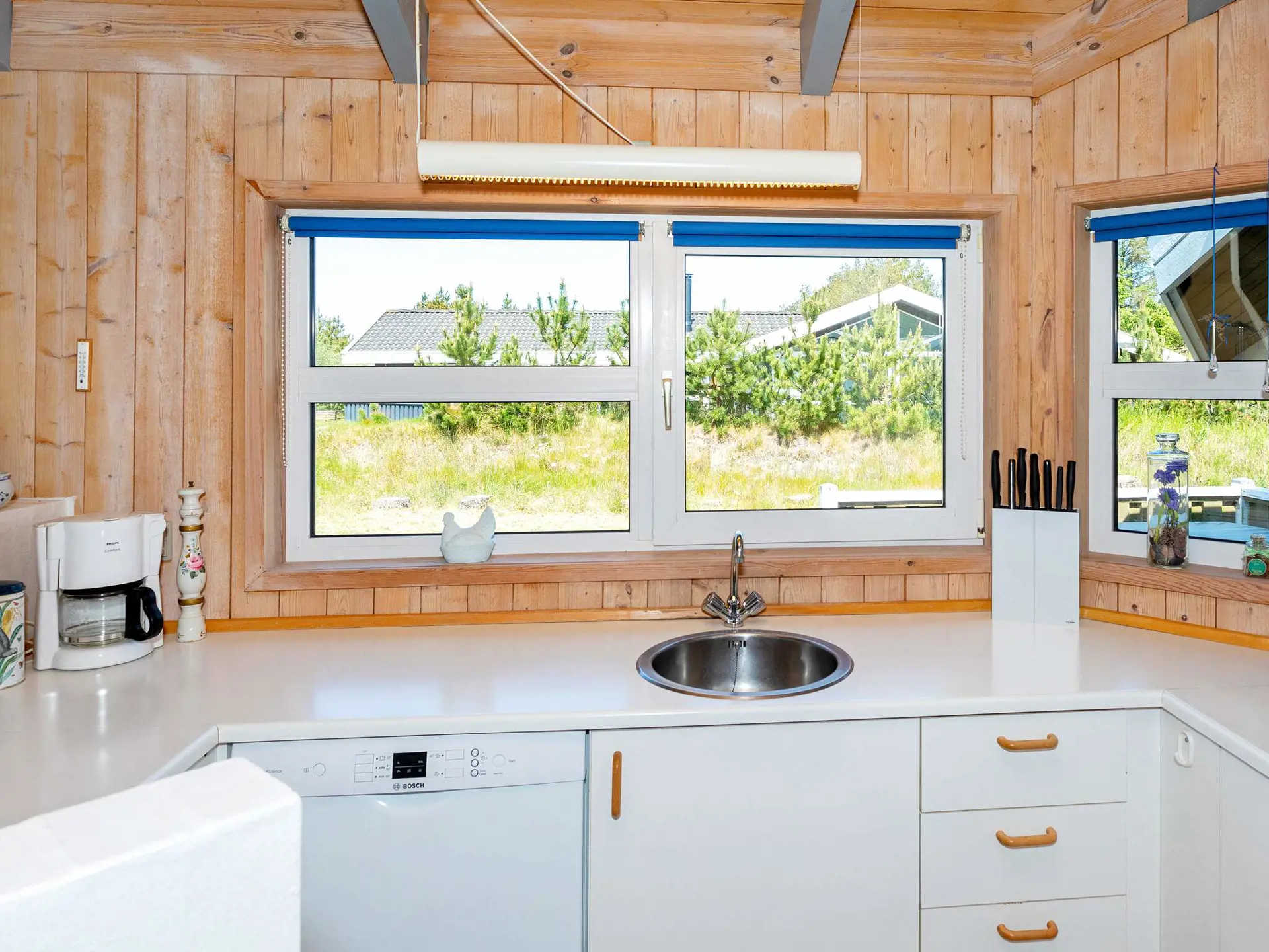 Die offene Küche ist gut ausgestattet und geht nahtlos in das Wohnzimmer über – ein gemütlicher Raum für gemeinsame Mahlzeiten und Entspannung. Hier können Sie die Wärme des Holzofens genießen, Musik auf der Stereoanlage hören oder fernsehen – sowohl deutsche als auch dänische Sender. Vom Wohnbereich aus gelangen Sie direkt auf die teilweise überdachte Terrasse, die sich perfekt für ruhige Morgenstunden beim Kaffeetrinken oder Sommerabende im Freien eignet. Praktische Details wie Fußbodenheizung in Küche und Wohnzimmer sowie eine Wasch-Trockner-Kombination sorgen das ganze Jahr über für Komfort und Bequemlichkeit.
