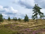 Im Garten gibt es eine Schaukel und eine große Feuerstelle. Das Haus steht auf einem naturbelassenen Grundstück, das teilweise mit Fichten, Moos und Büschen bewachsen ist.