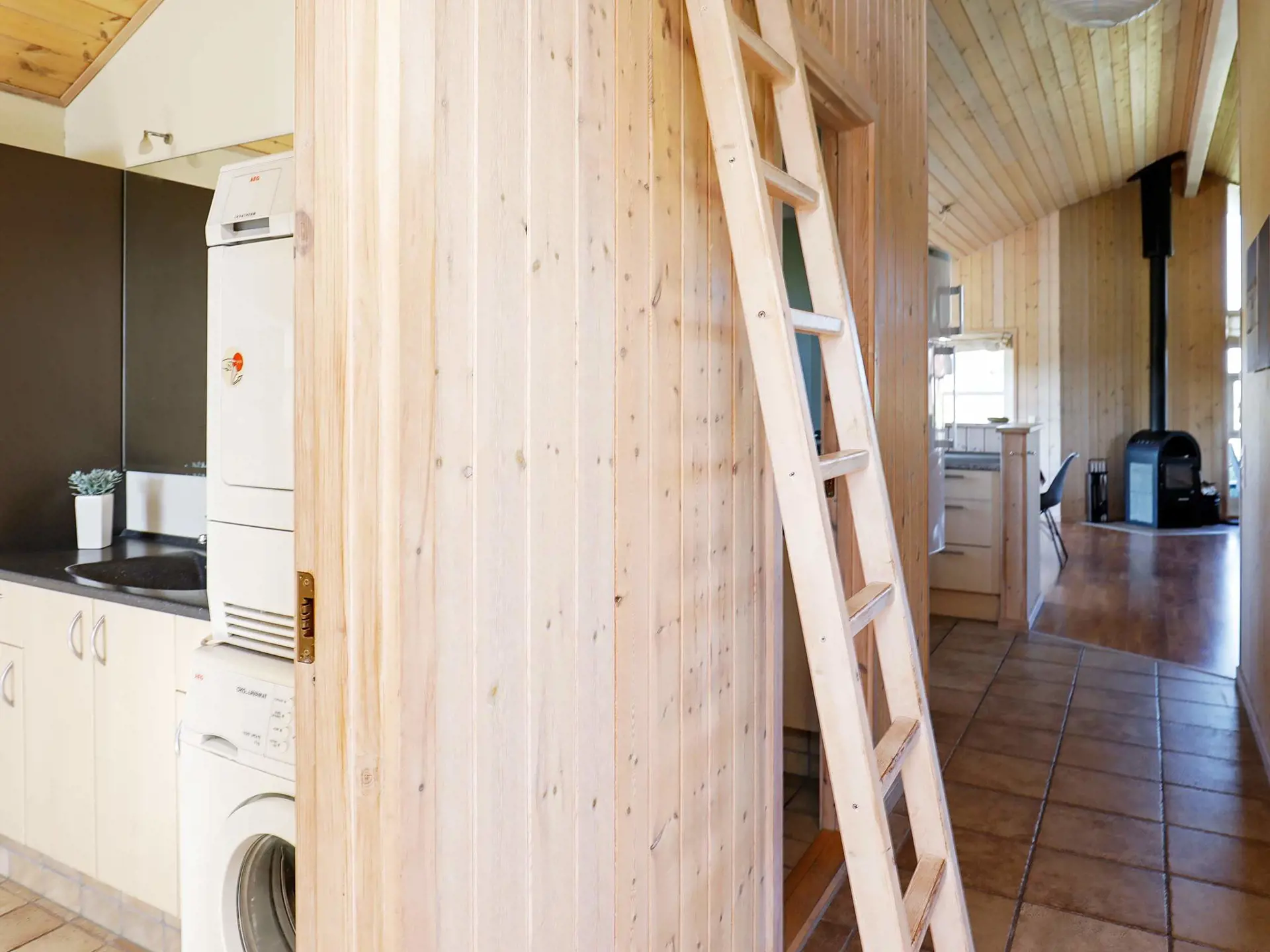 Zum Ferienhaus gehört ein großer, heller Aufenthaltsbereich mit Ledergarnitur, einer kleineren Sitzgruppe und einem Essbereich. Außerdem gibt es einen Fernseher mit SAT-Empfänger und DVD-Spieler, schnelles WLAN, Stereoanlage und Holzofen im Haus. Die Küchemzeile ist offen in den Wohnbereich integriert, jedoch durch eine Halbmauer etwas abgeschirmt. Zur guten Küchenausstattung gehören u.a. Cerankochfeld mit Backofen, Geschirrspüler und Mikrowelle. Darüberhinaus gibt es drei Schlafzimmer im Haus mit jeweils einem Doppelbett. Oben unter der Dachschräge findet man zudem einen 12 m2 großen Hems mit weiteren Schlafplätzen für Kinder sowie TV. Für Kleinkinder stehen auch Hochstuhl und Kinderbett bereit. Es gibt zwei Badezimmer im Ferienhaus, das größere davon mit Whirlpool, Sauna und breiter Duschnische. Alle Klinkerböden sind beheizt.
