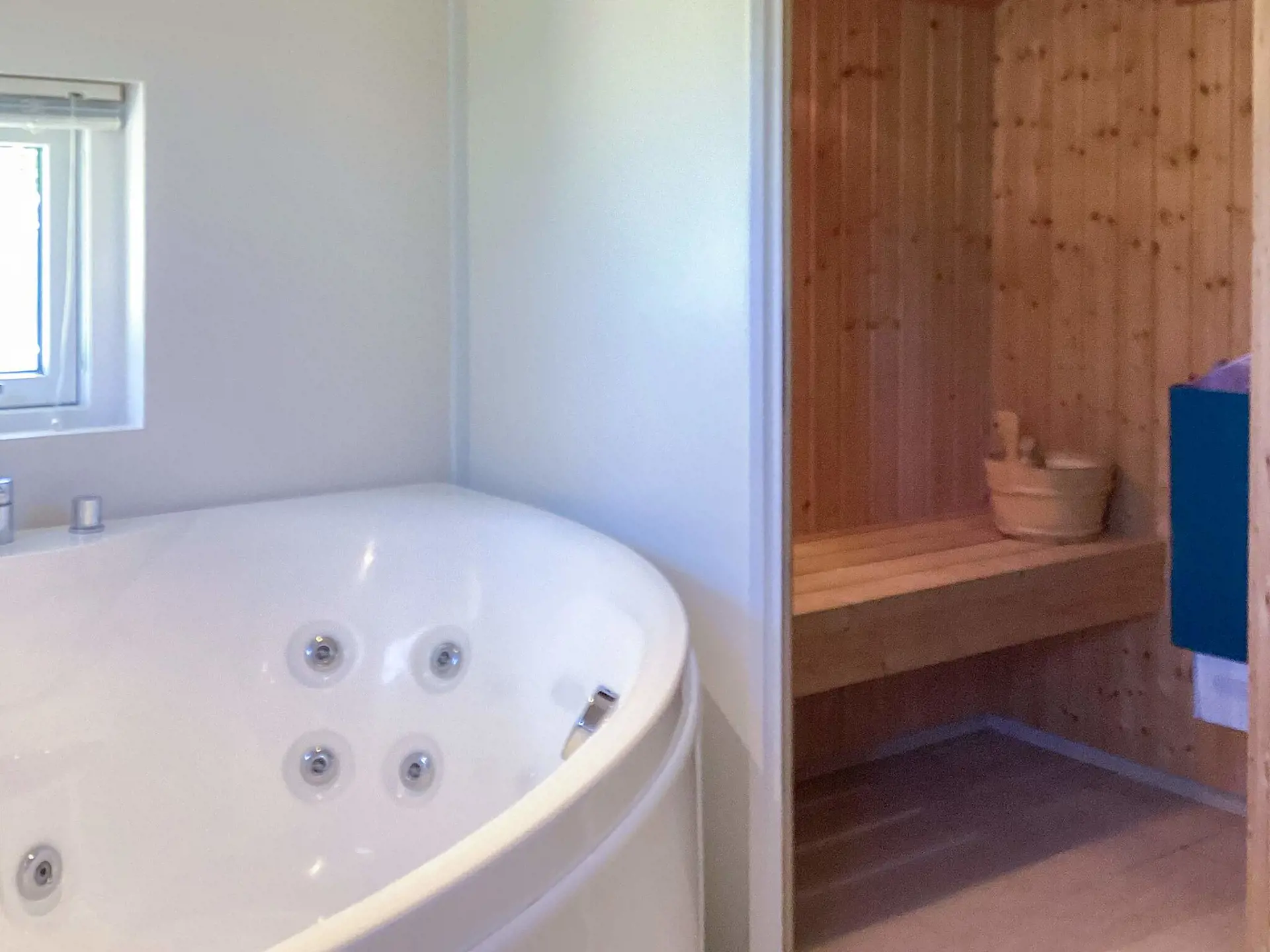 Das helle und ansprechende Badezimmer ist mit einer Whirlpool-Badewanne für 2 Personen, einem Fernseher, einer Sauna für 2 Personen, einer Badeecke, Dusche und WC ausgestattet.