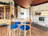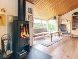 Im Ferienhaus gemütlich gestalteter Küchen-/Wohnbereich mit Essecke und Kaminofen, mit viel Platz für das Familienleben. Von dort hat man direkten Zugang zur Südterrasse davor. Zudem zwei Schlafzimmer und Bad im Haus.