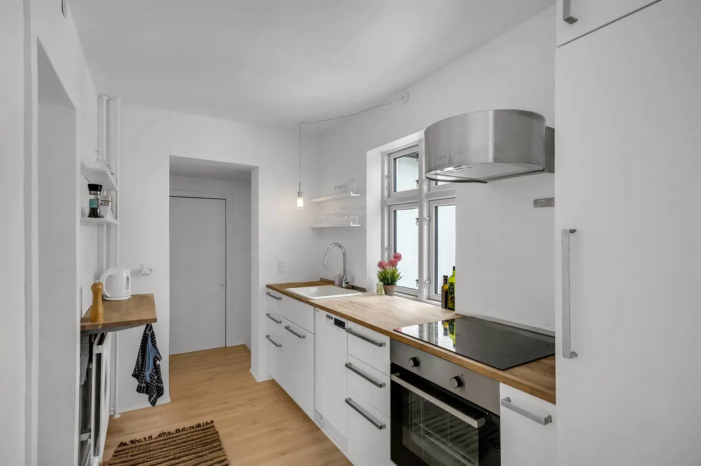 Die Küche ist mit Kühlschrank ausgestattet. Außerdem gibt es 4 Induktions-Kochzonen, Umluftofen sowie Geschirrspüler.