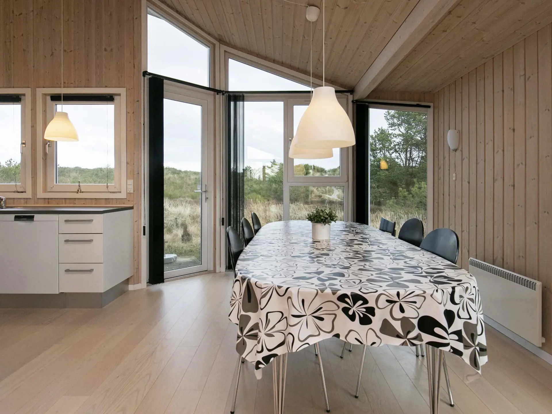 Das Ferienhaus hat einen gut ausgestatteten Küchen-/Wohnbereich mit großen Fenstern und offener Zimmerdecke bis zum First und somit hellem, luftigem Ambiente. Hier gibt es viel Platz für das Familienleben und gemeinsame Aktivitäten. Eine energieeffiziente Wärmepumpe sorgt zu jeder Jahreszeit für ein angenehmes Innenklima. Außerdem gibt es zwei große, helle Schlafzimmer, mit guten Schlafplätzen und Stauraum, sowie einen offenen Hems oben unter der Dachschräge, mit Matratze und solider Leitertreppe als Zugang. Waschmaschine und Trockner findet man unten im offenen Eingangsbereich. Außerdem großes Badezimmer im Haus, mit Dusche und Fußbodenheizung sowie Whirlpool und Sauna.