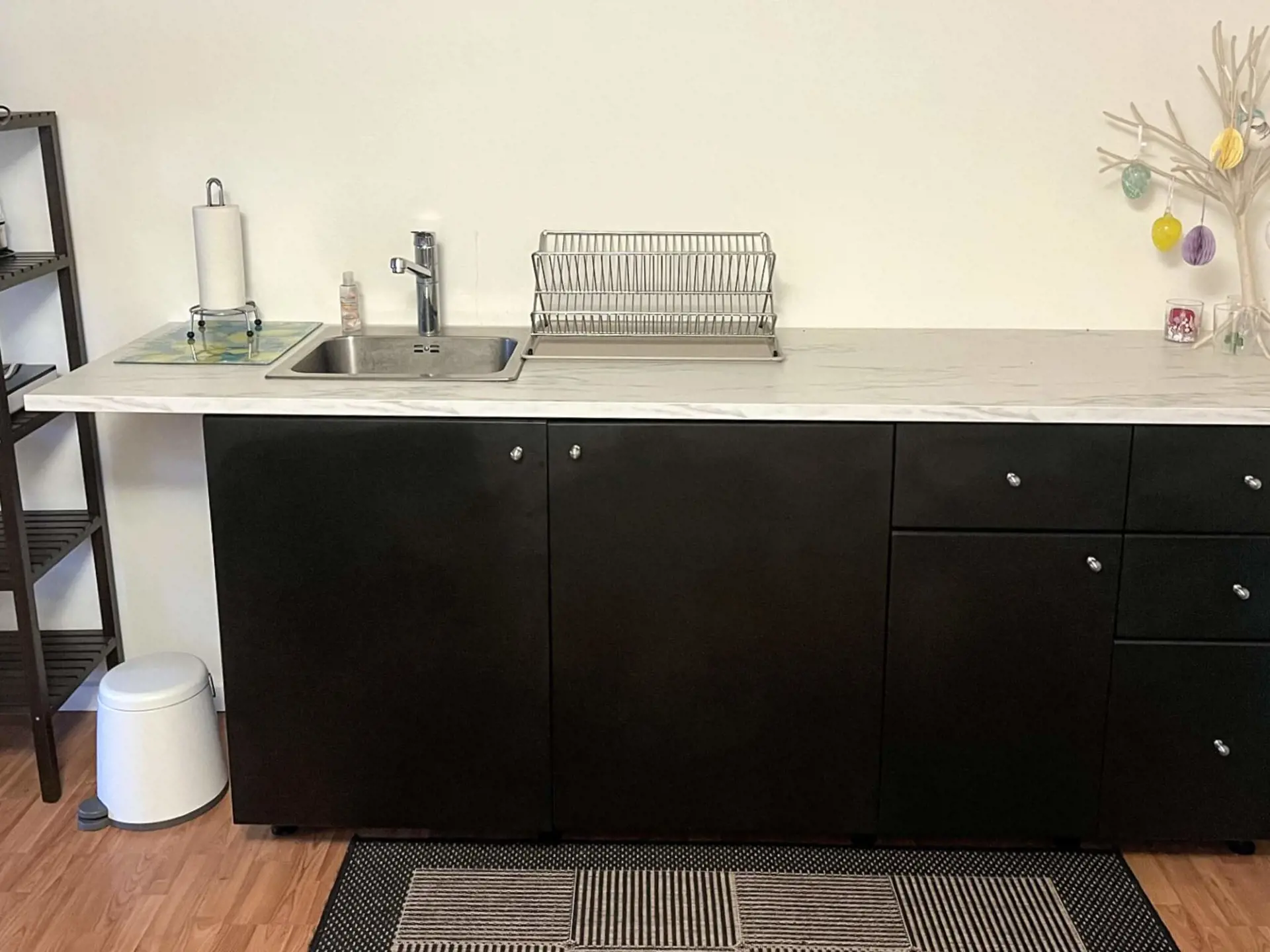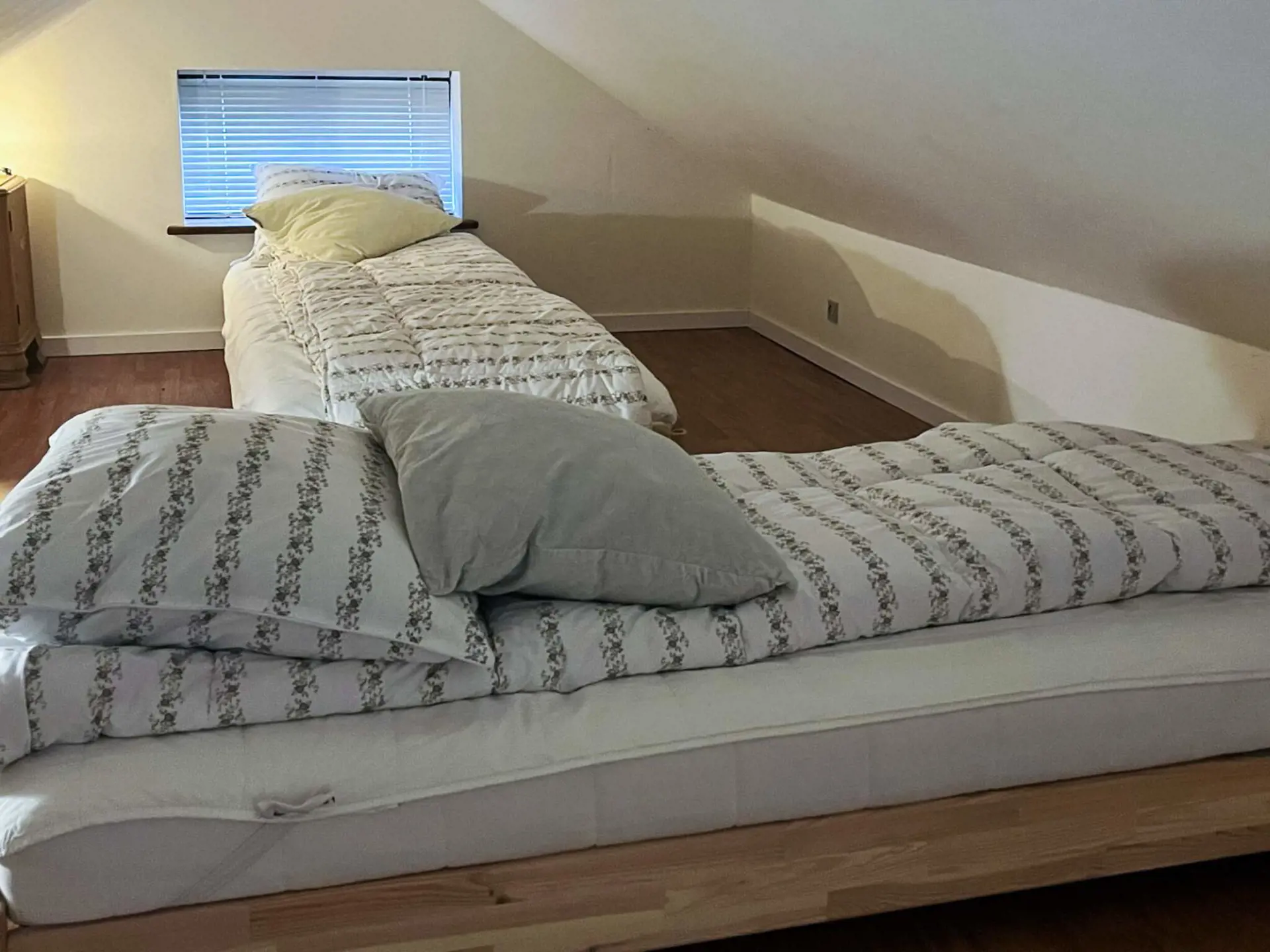 Der Anbau ist hell und geräumig und besteht aus einer Eingangsdiele, einem großen, offenen Raum mit einer größeren Küchenzeile mit u.a. Heißluftfritteuse in einem Bereich und einem Wohnzimmer und einem Doppelbett im anderen. Vom Wohnzimmer führt eine Treppe hinauf zum Dachboden/Hems. Beachten Sie bitte, dass der Dachboden offen ist, was ihn perfekt macht, wenn Sie sich etwas zurückziehen möchten, aber dennoch Teil des offenen Raums darunter sein möchten.